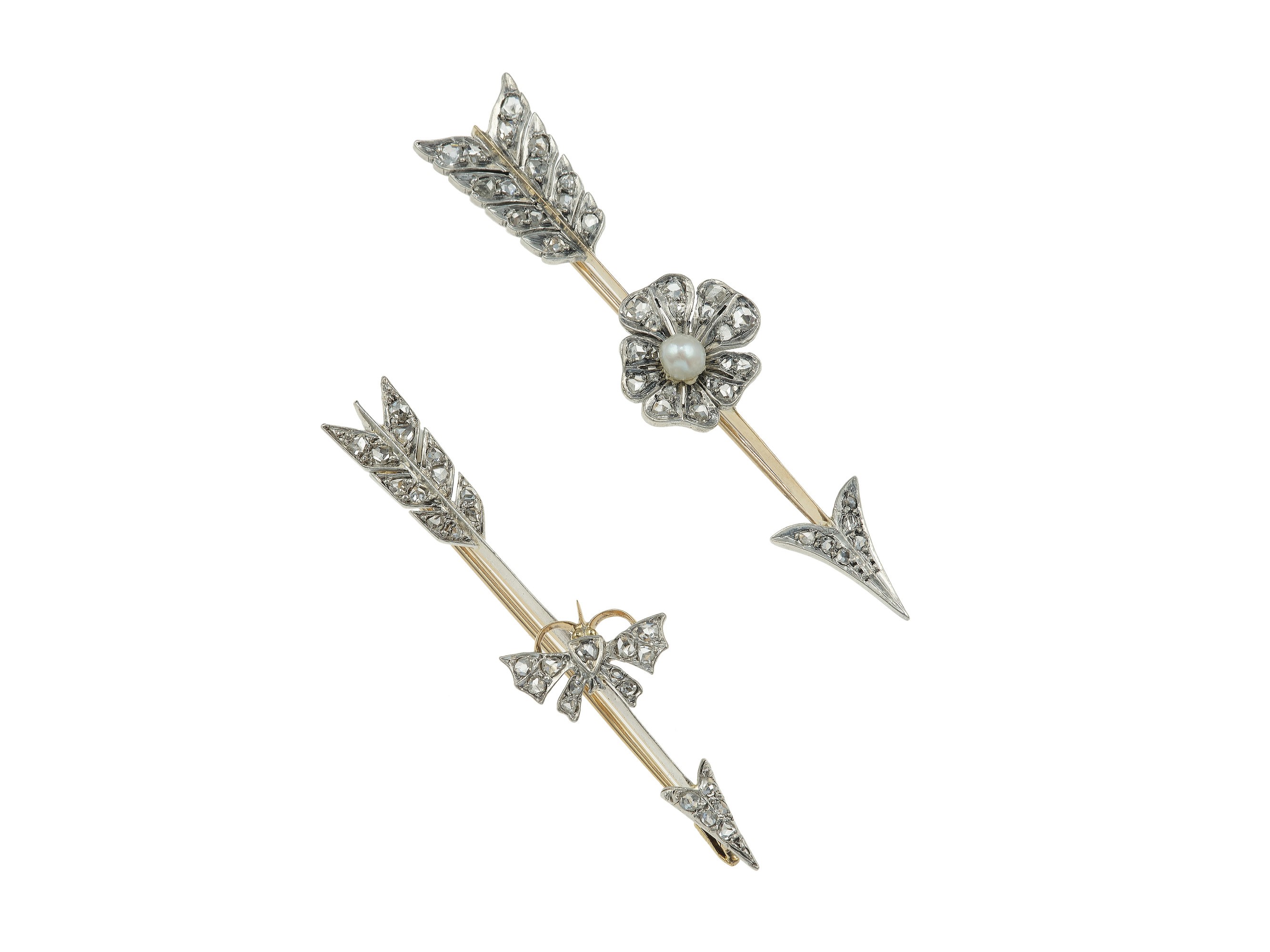 Two diamond, low-karat gold and silver "Arrow" brooches
