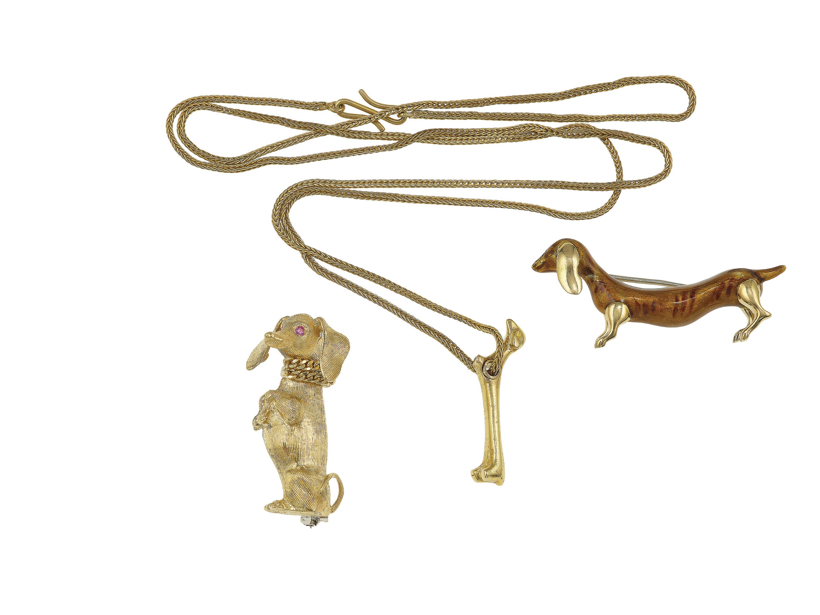 Two gold brooches and one gold pendent necklace