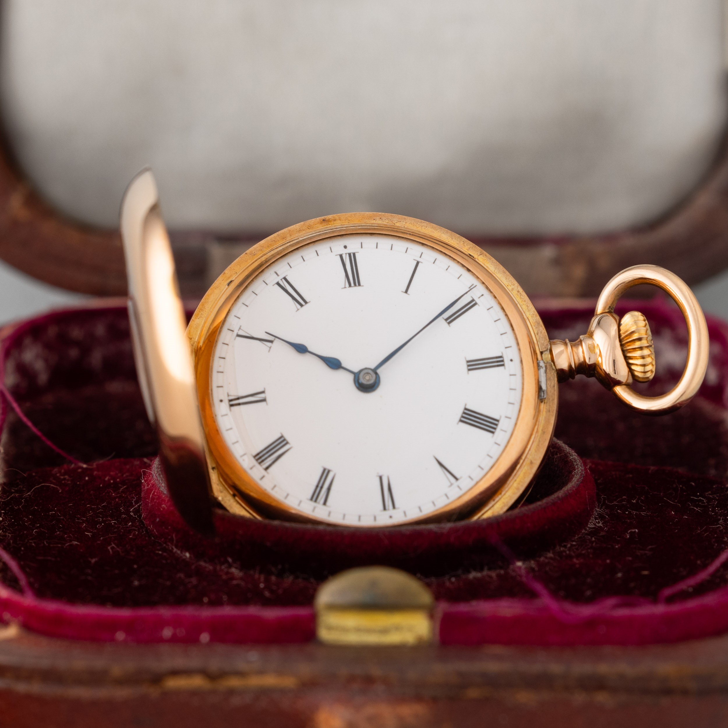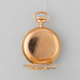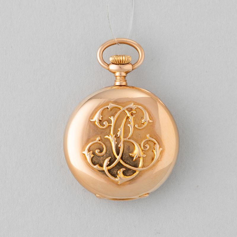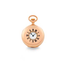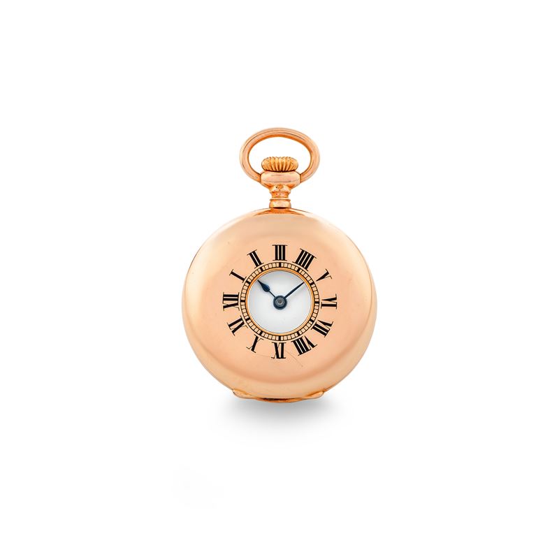 'Occhio di bue' neck watch in 18k rose gold, white enamel dial with Roman numerals, with original box, circa 1900