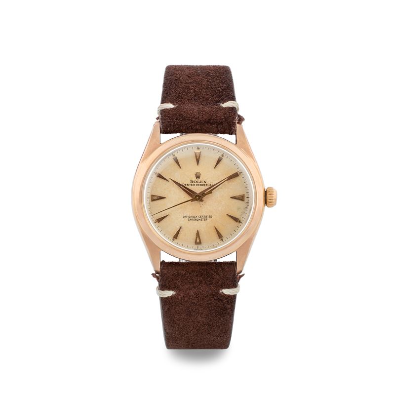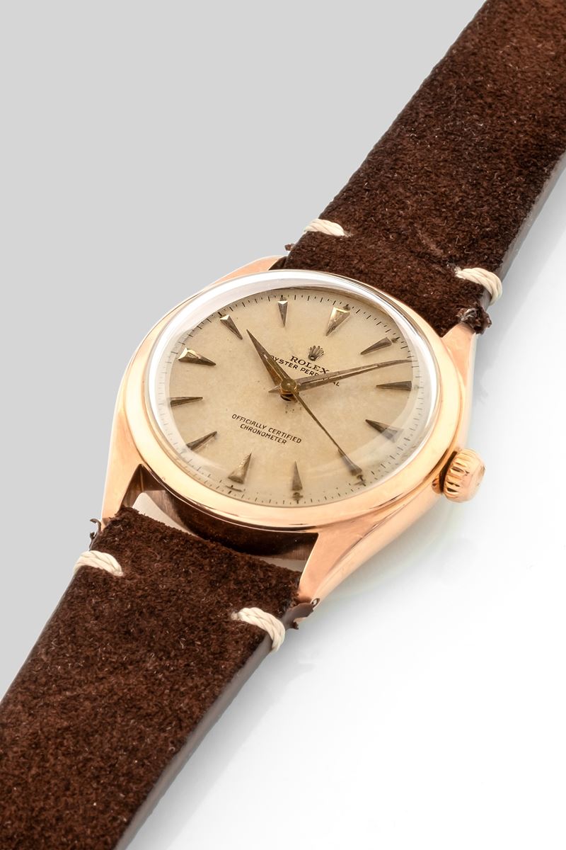 Oyster Perpetual Bubbleback ref 6084 in 18k pink gold, grenè dial, dauphine hands, circa 1950