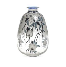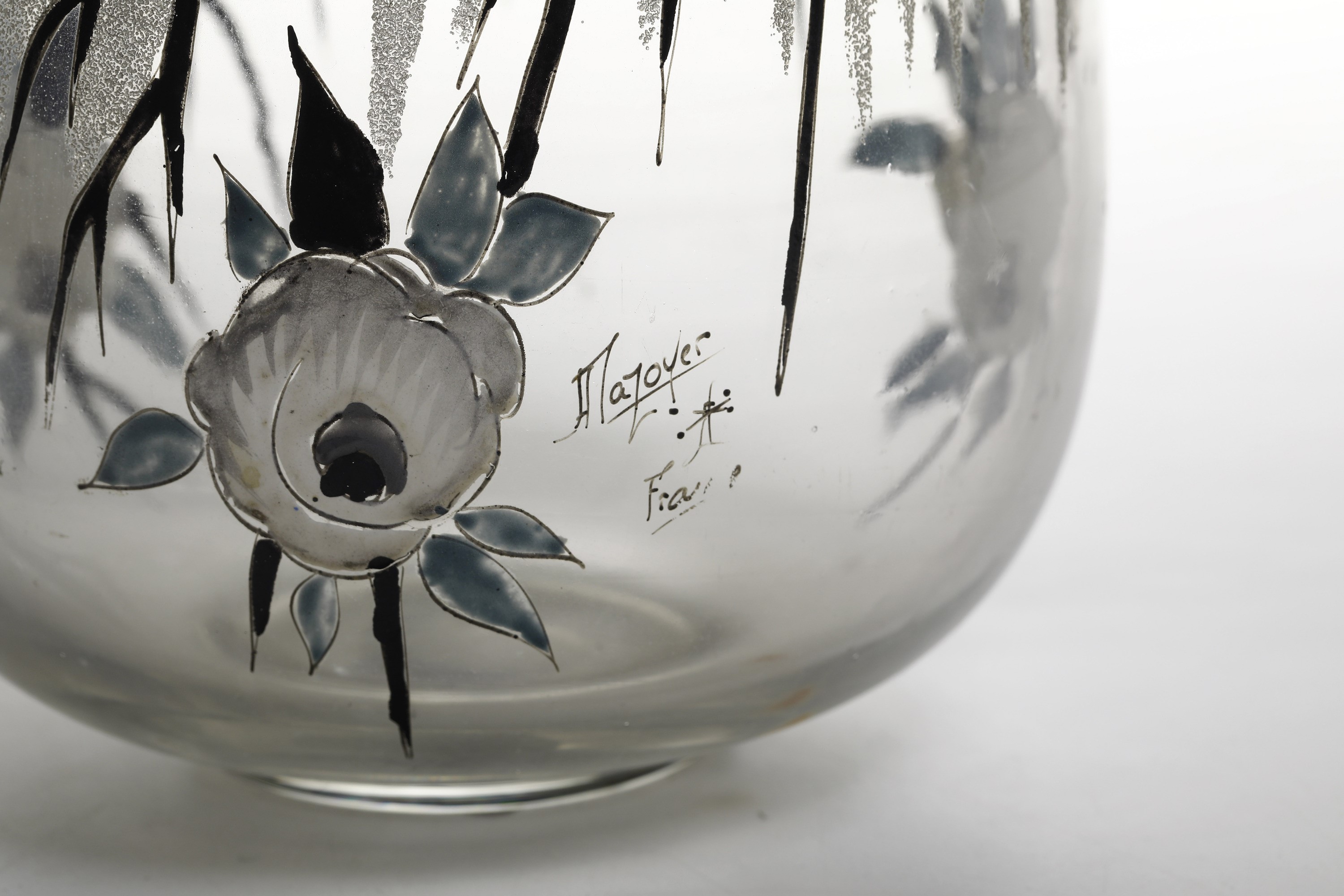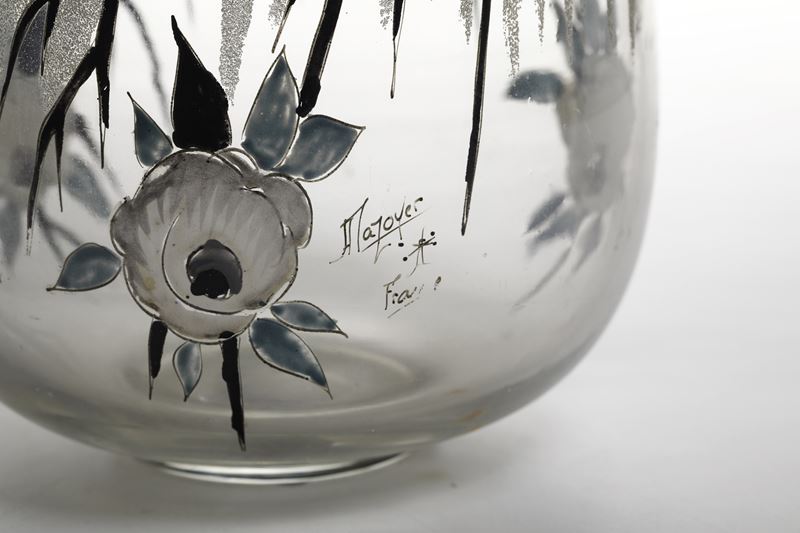 Vaso in forma di uovo con piccolo collo svasato in vetro soffiato con decoro floreale a smalti policromi.