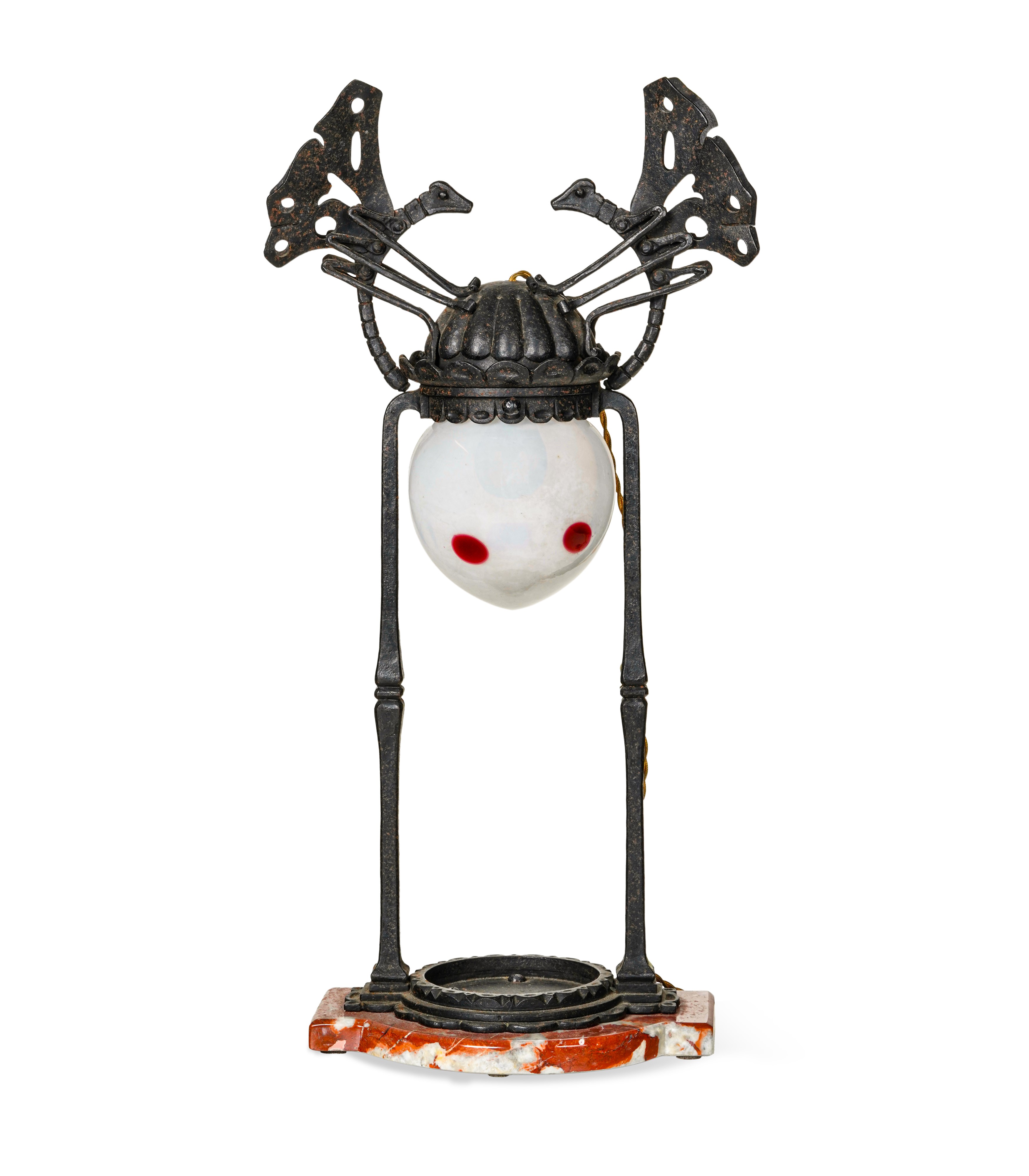 Lampada da tavolo in ferro lavorato su basamento in marmo con decoro di libellule stilizzate. Diffusore a goccia in vetro soffiato.