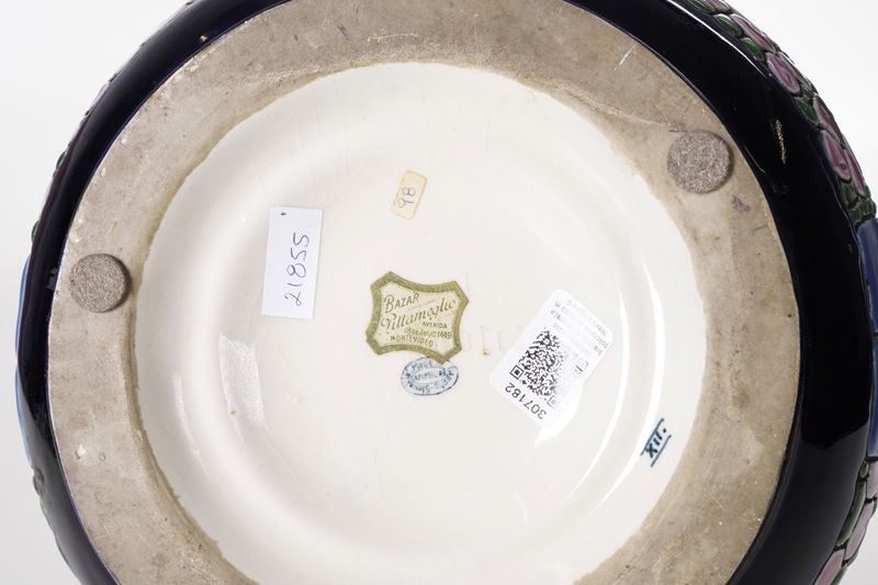Vaso ad uovo con anse applicate in ceramica con decoro policromo a rilievo di pappagallo stilizzato su ramo su fondo fiorito.