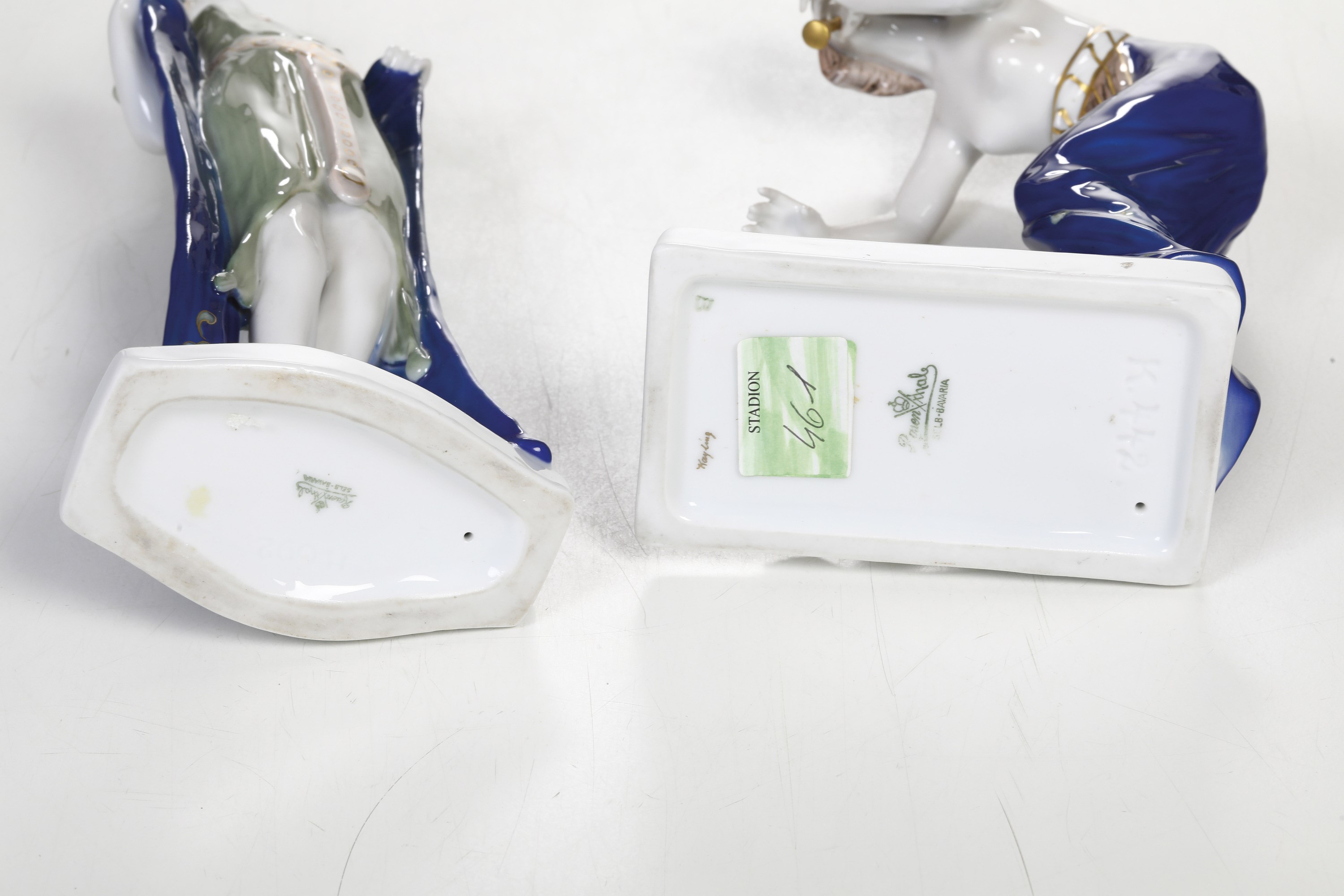 Due statuine raffiguranti danzatrice e incantatrice di serpenti in porcellana con decoro policromo.
