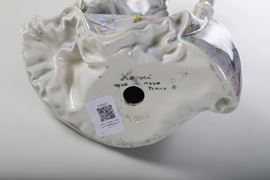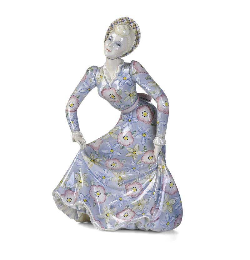 Figura di donna con ampio abito floreale e cappello in terraglia a colaggio con decoro policromo.