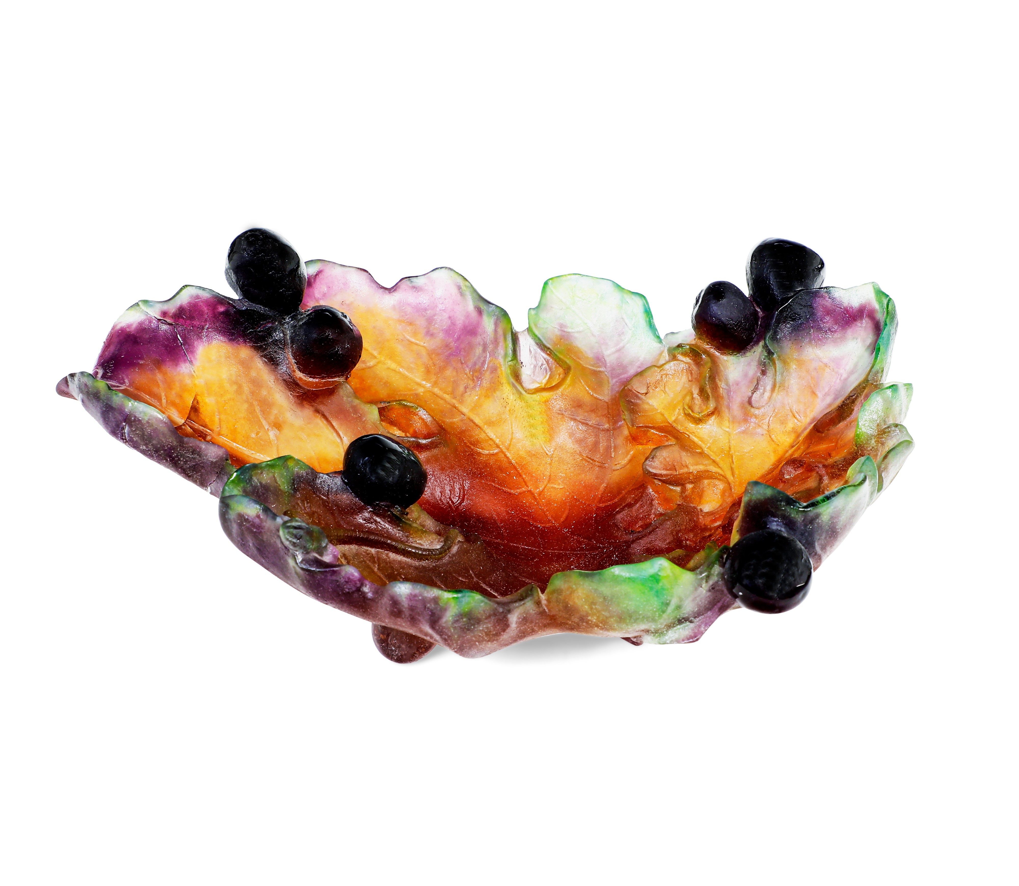 Coppa svuotatasche in pasta vitrea policroma in forma di foglia con bacche a rilievo.