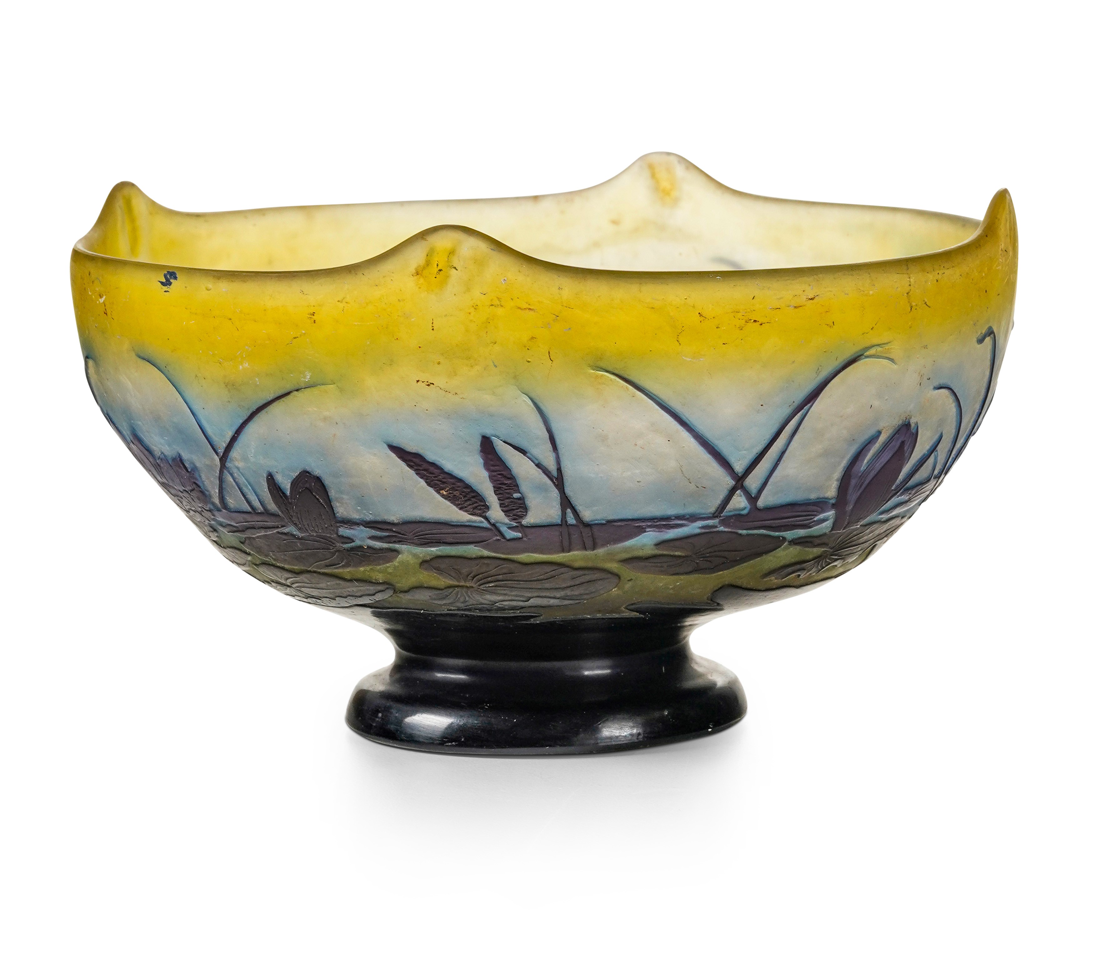 Coppa su piede e pinzature sul bordo in vetro a cammeo con decoro di paesaggio lacustre.