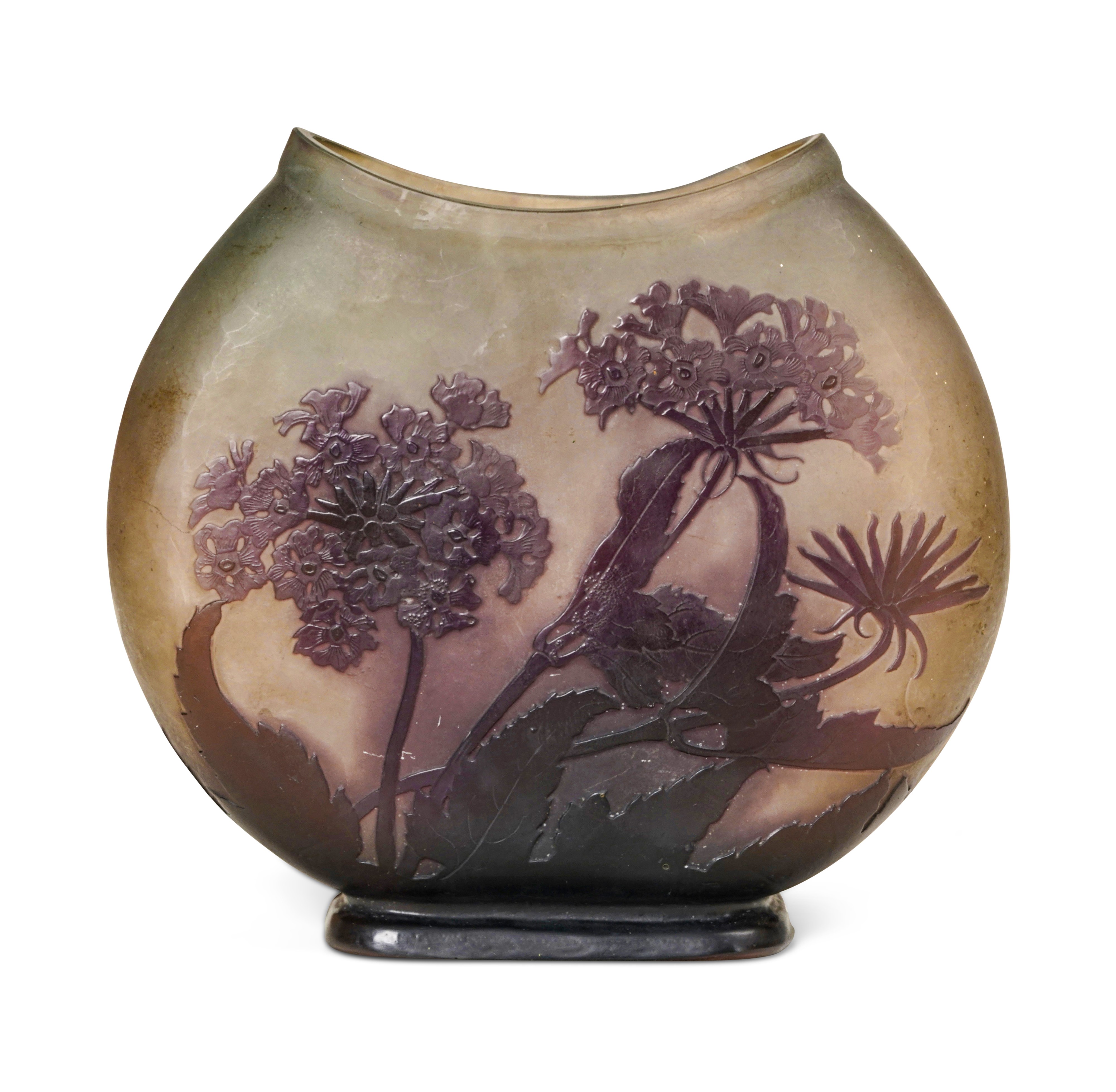 Vaso schiacciato a mezzaluna su basamento rettangolare in vetro a cammeo con decoro floreale di verbene.