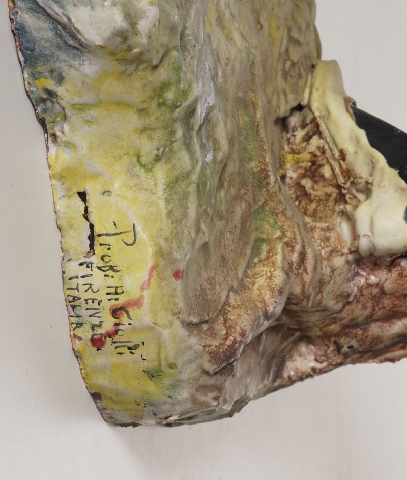 Grande figura di Arlecchino in terracotta maiolicata con decoro a smalti policromi.