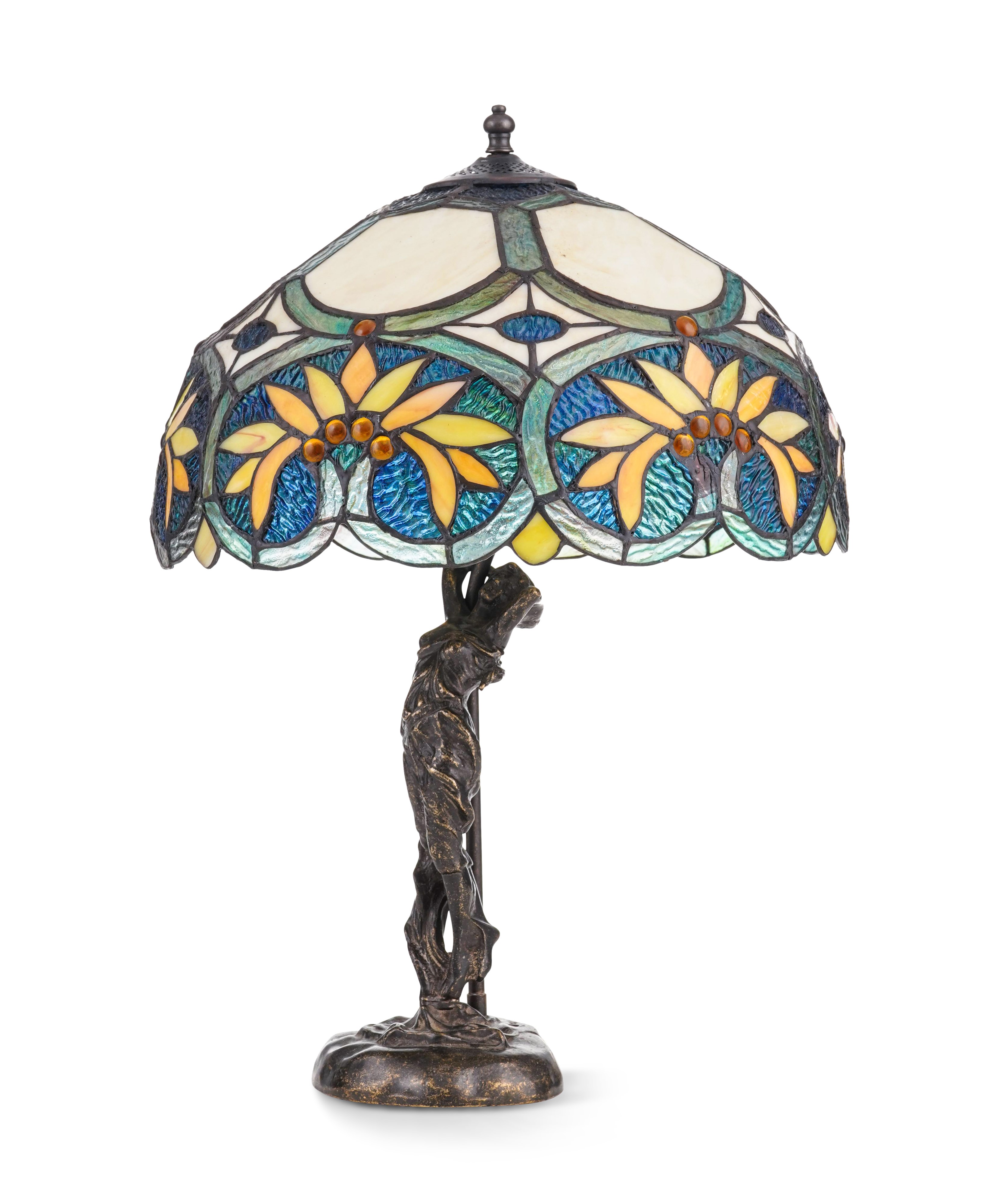 Lampada da tavolo liberty con basamento in metallo cesellato raffigurante nudo di donna. Diffusore in vetro piombato con motivi vegetali e gemme in rilievo.