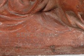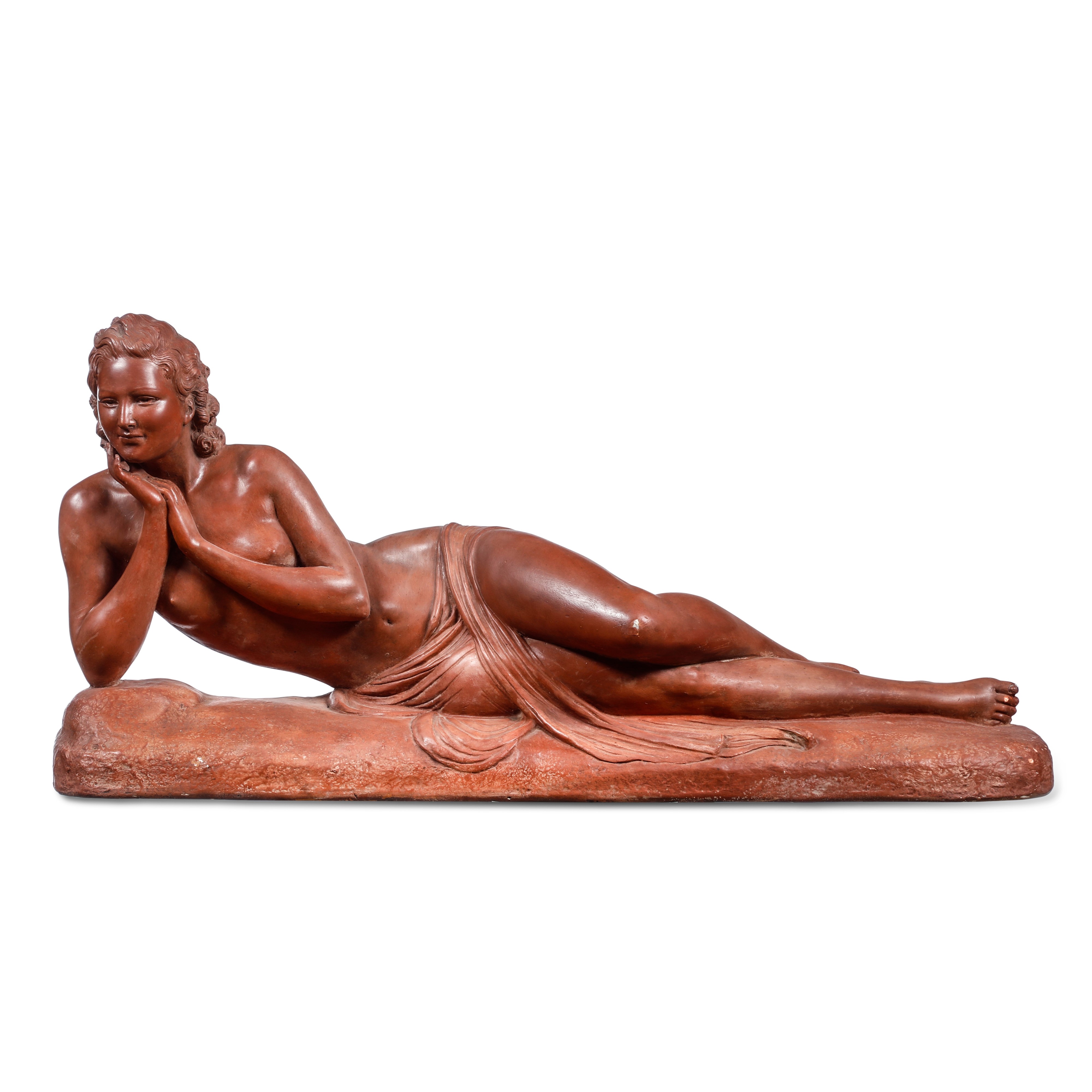 Scultura raffigurante nudo disteso in gesso patinato.
