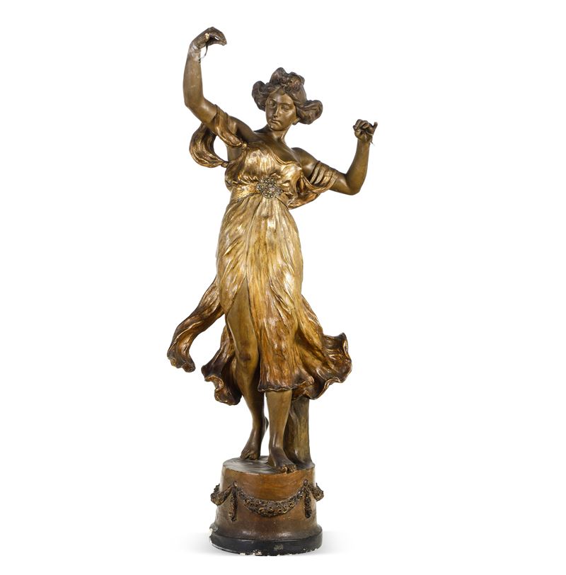 Grande statua di danzatrice in terracotta smaltata e rifinita con dorature.