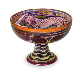 Fruttiera su piede a campana in ceramica con decoro policromo di felini ed onde stilizzate. Superficie interamente lustrata.