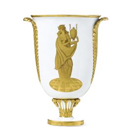 Vaso a campana schiacciata con anse a piuma su basamento a capitello in porcellana con decoro in oro a punta d'agata di figura allegorica.
