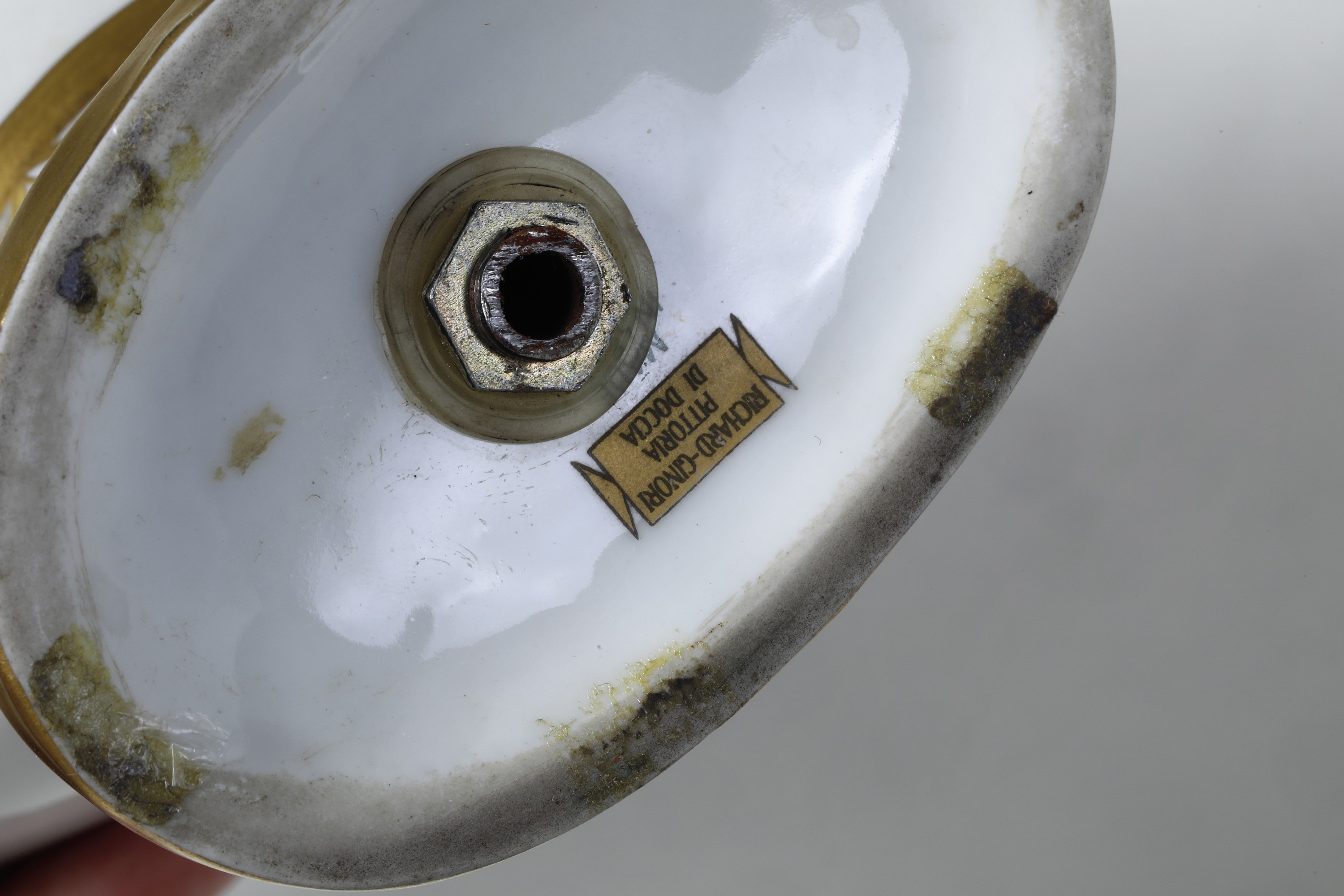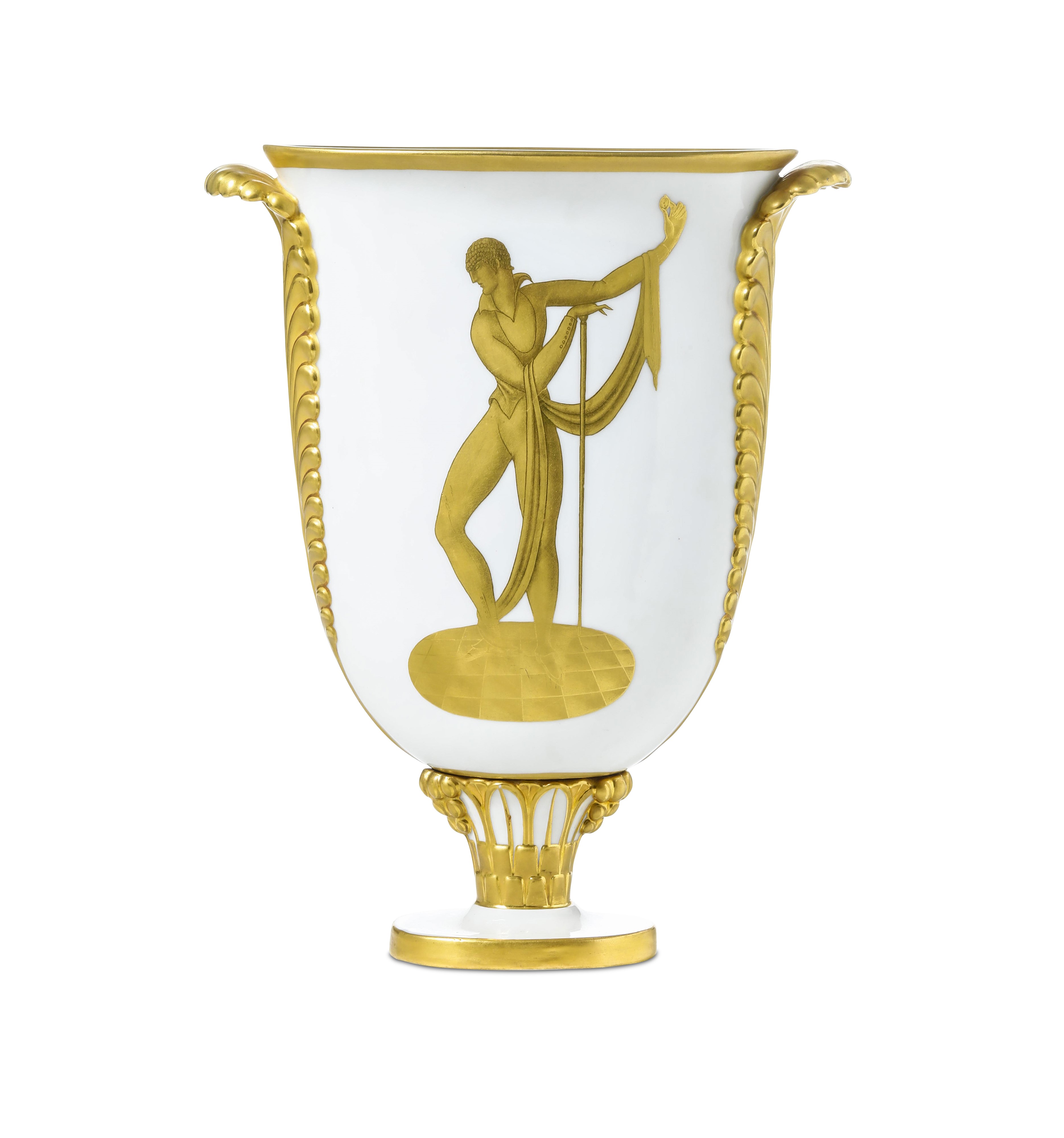 Vaso a campana schiacciata con anse a piuma su basamento a capitello in porcellana con decoro in oro a punta d'agata.