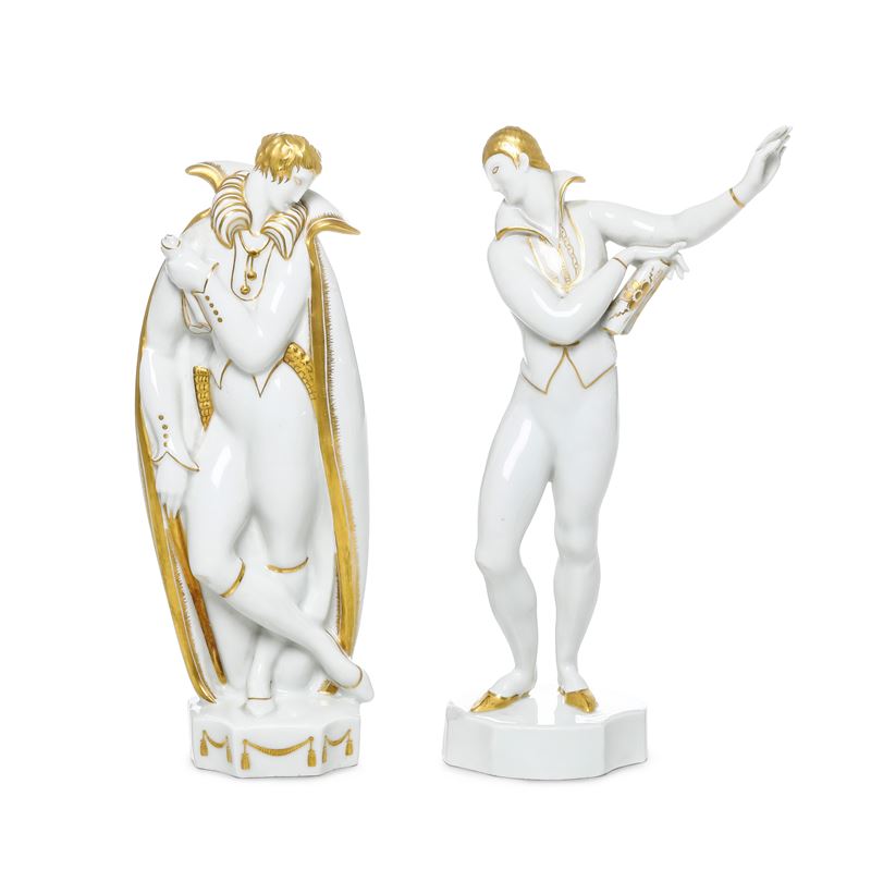 Due sculture in porcellana raffiguranti personaggi in costume con decoro in oro al terzo fuoco.