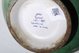 Vaso serie Venatoria di forma sferica con collo cilindrico e piede troncoconico in maiolica a fondo verde con decoro a seppia.