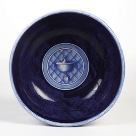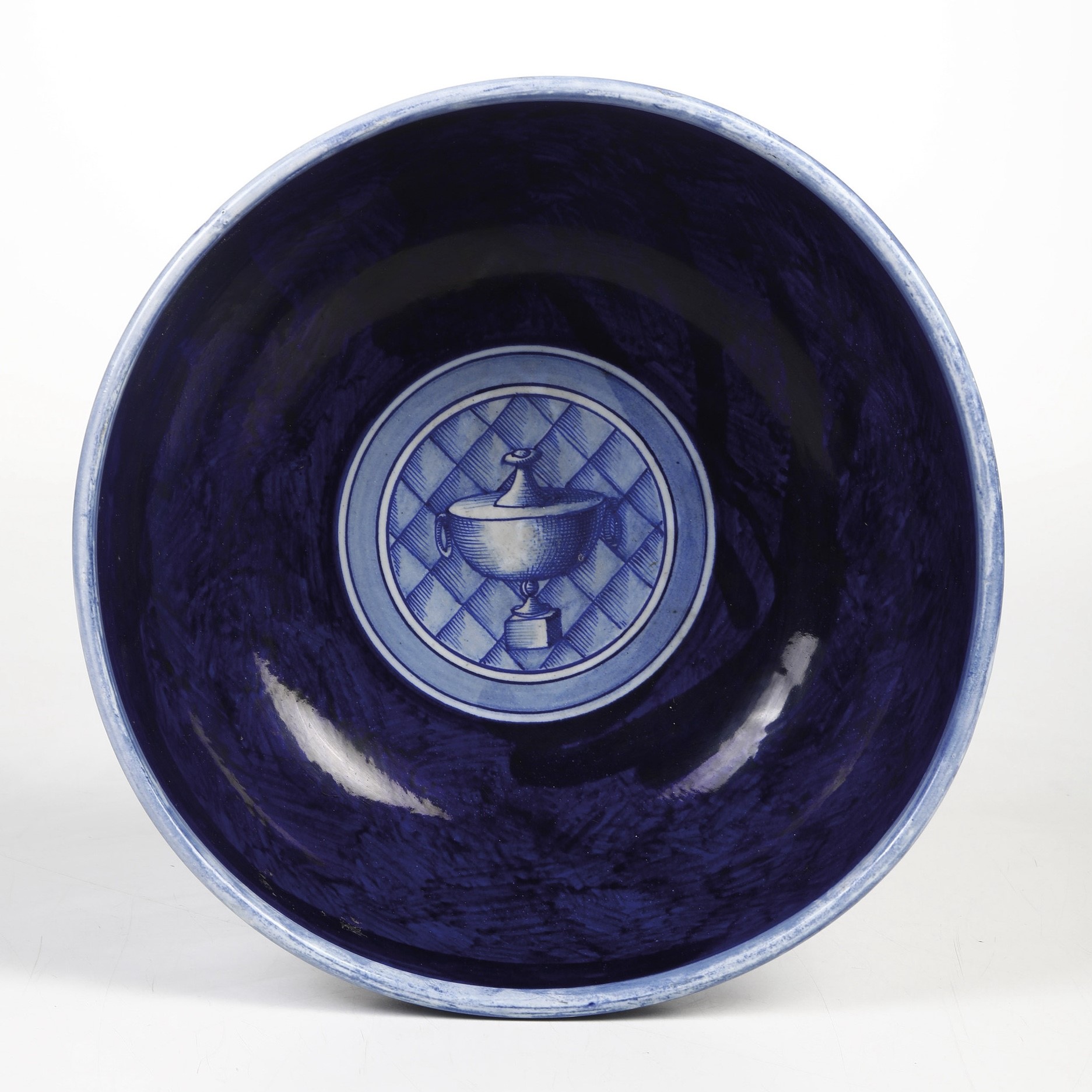 Coppa su piede circolare in terracotta maiolicata a fondo blu con decoro a monocromo azzurro.