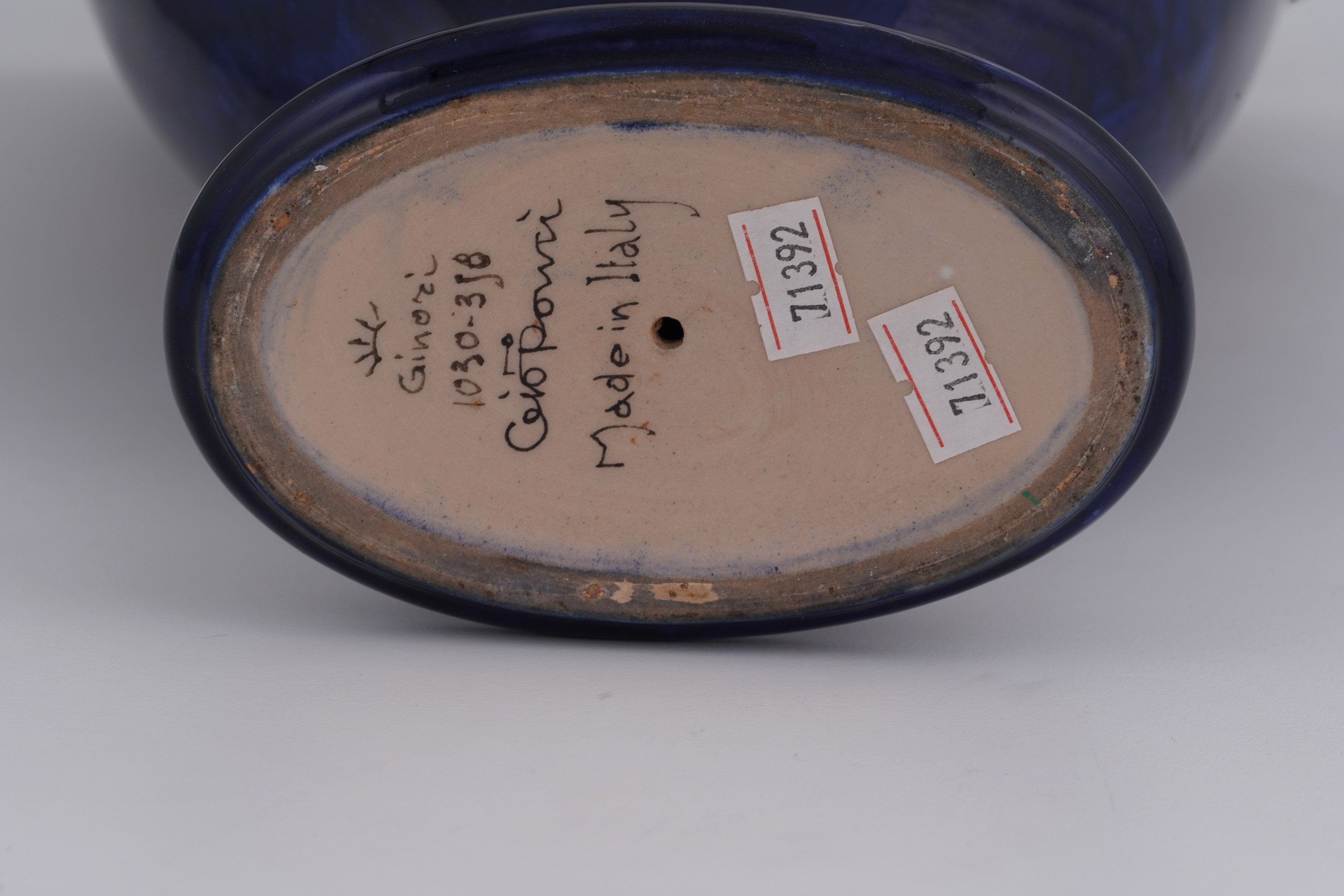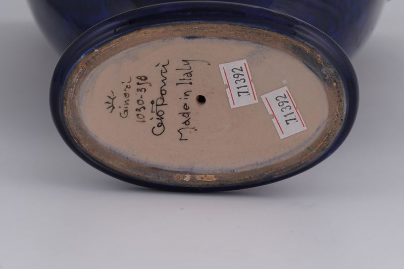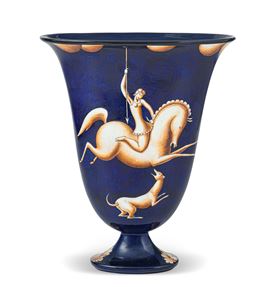 Vaso serie Venatoria a campana schiacciata su alto piede in terracotta maiolicata con decoro a seppia su fondo blu.