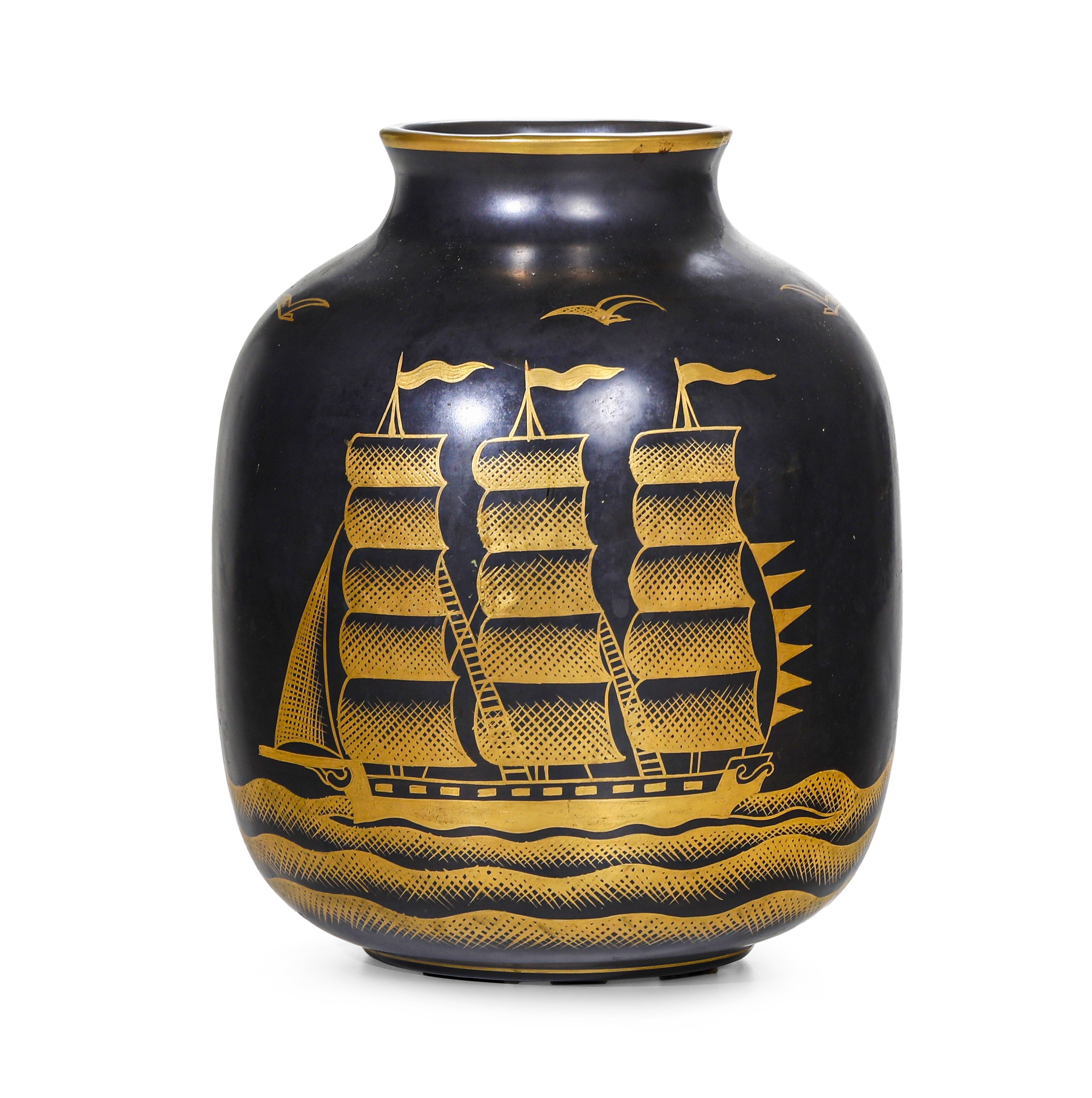 Vaso in terraglia a colaggio con decoro di veliero in oro su fondo nero antracite.