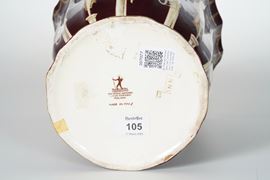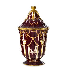 Vaso con coperchio in terraglia a colaggio con decoro di personaggi e festoni filettati in oro lavorato a punta d'agata su fondo scuro. Presa in forma di corolla costolata con festoni.