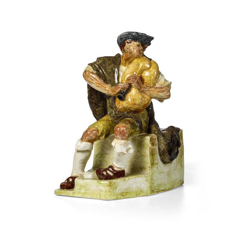 Figura rappresentante zampognaro in terraglia a colaggio con decoro policromo.