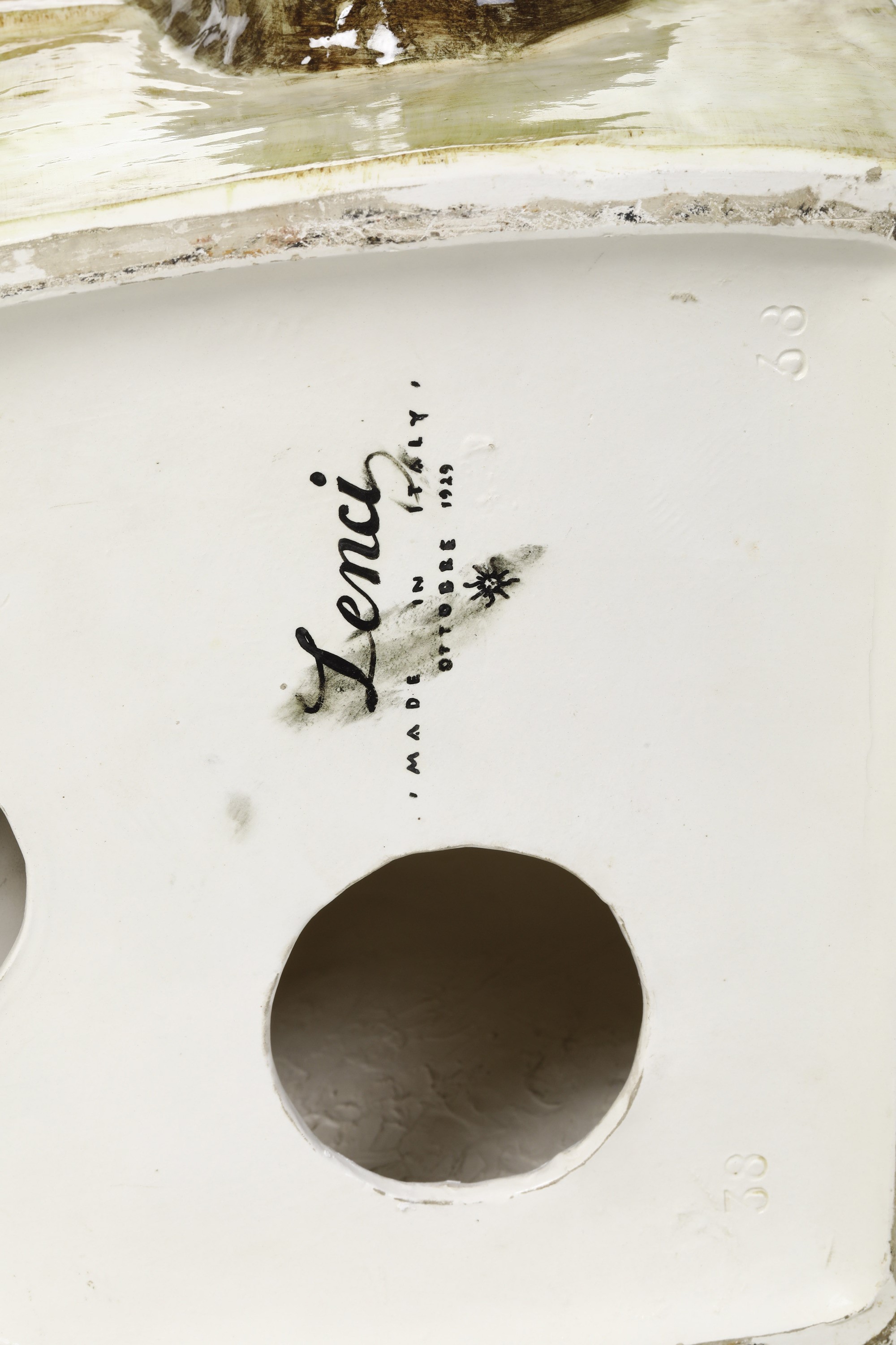 Marchio della manifattura, data alla base e iniziali dell'autore.