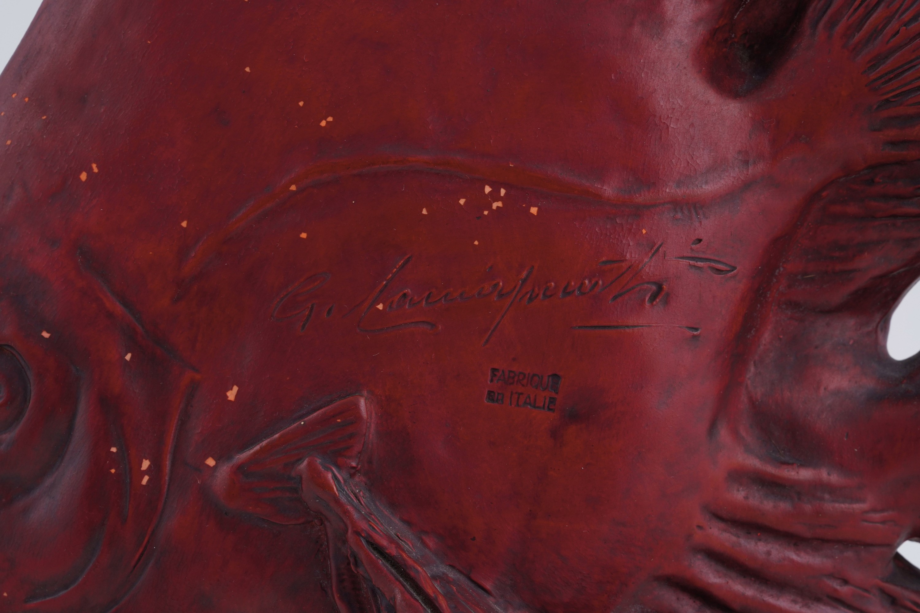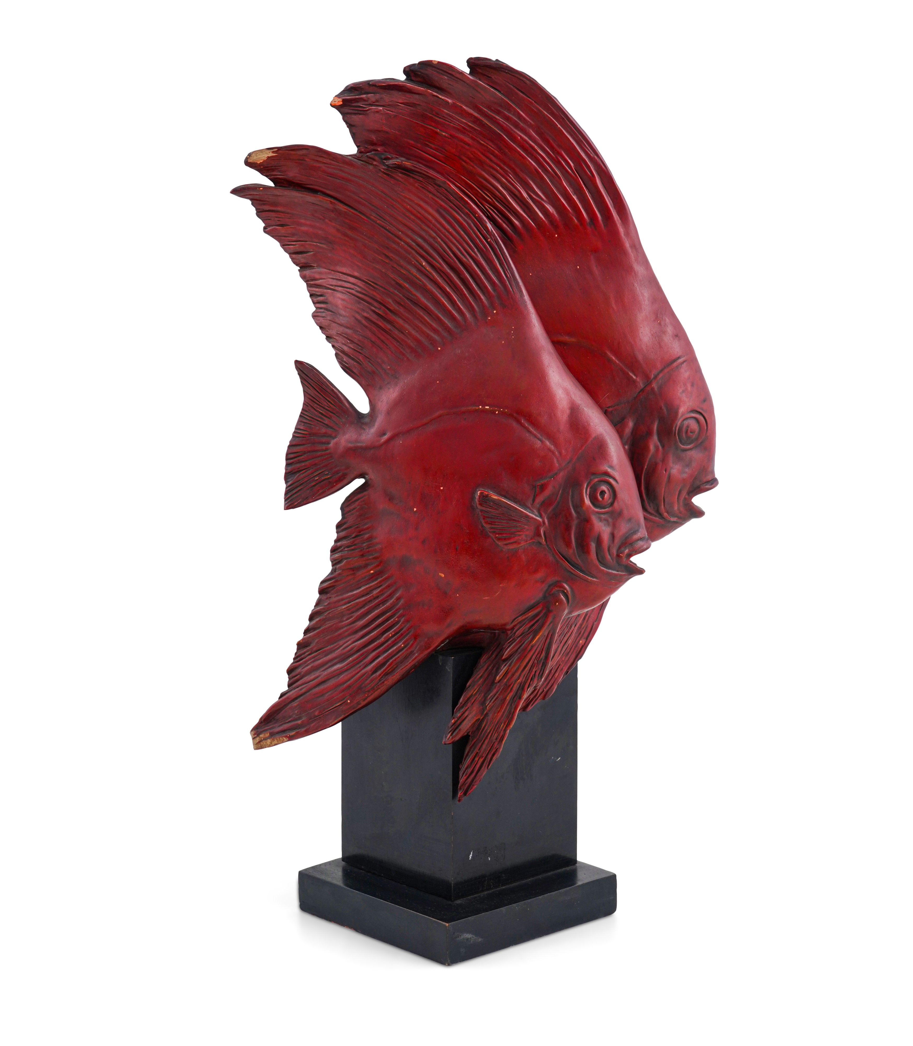 Scultura raffigurante coppia di pesci tropicali in ceramica a colaggio con decoro di smalto rosso. Basamento in legno.