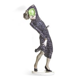 Figura di donna mossa dal vento in terraglia a colaggio con decoro policromo.