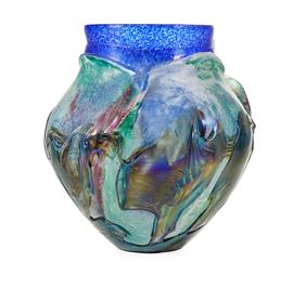 Vaso a cratere in vetro soffiato con decoro policromo lavorato a caldo.