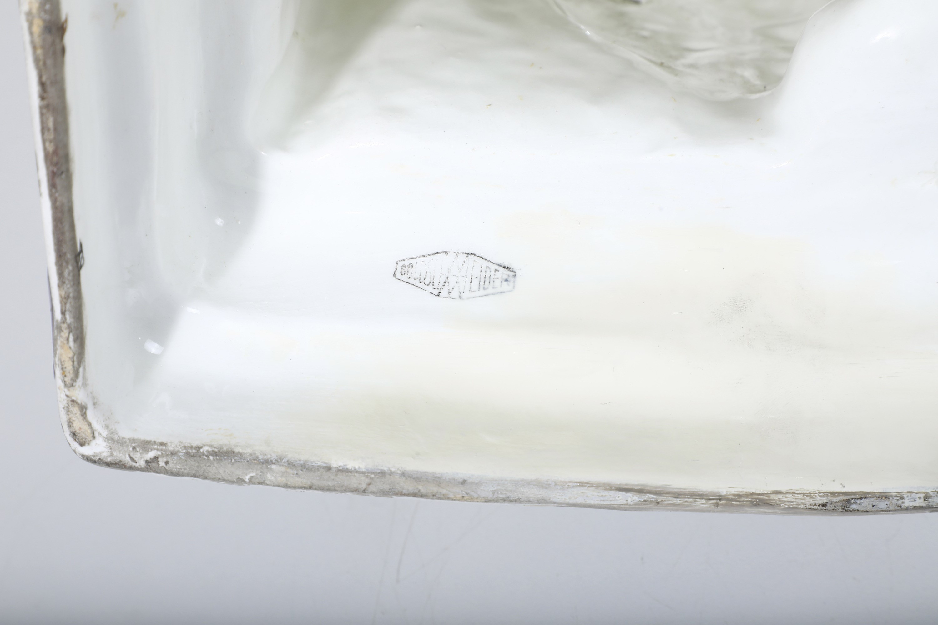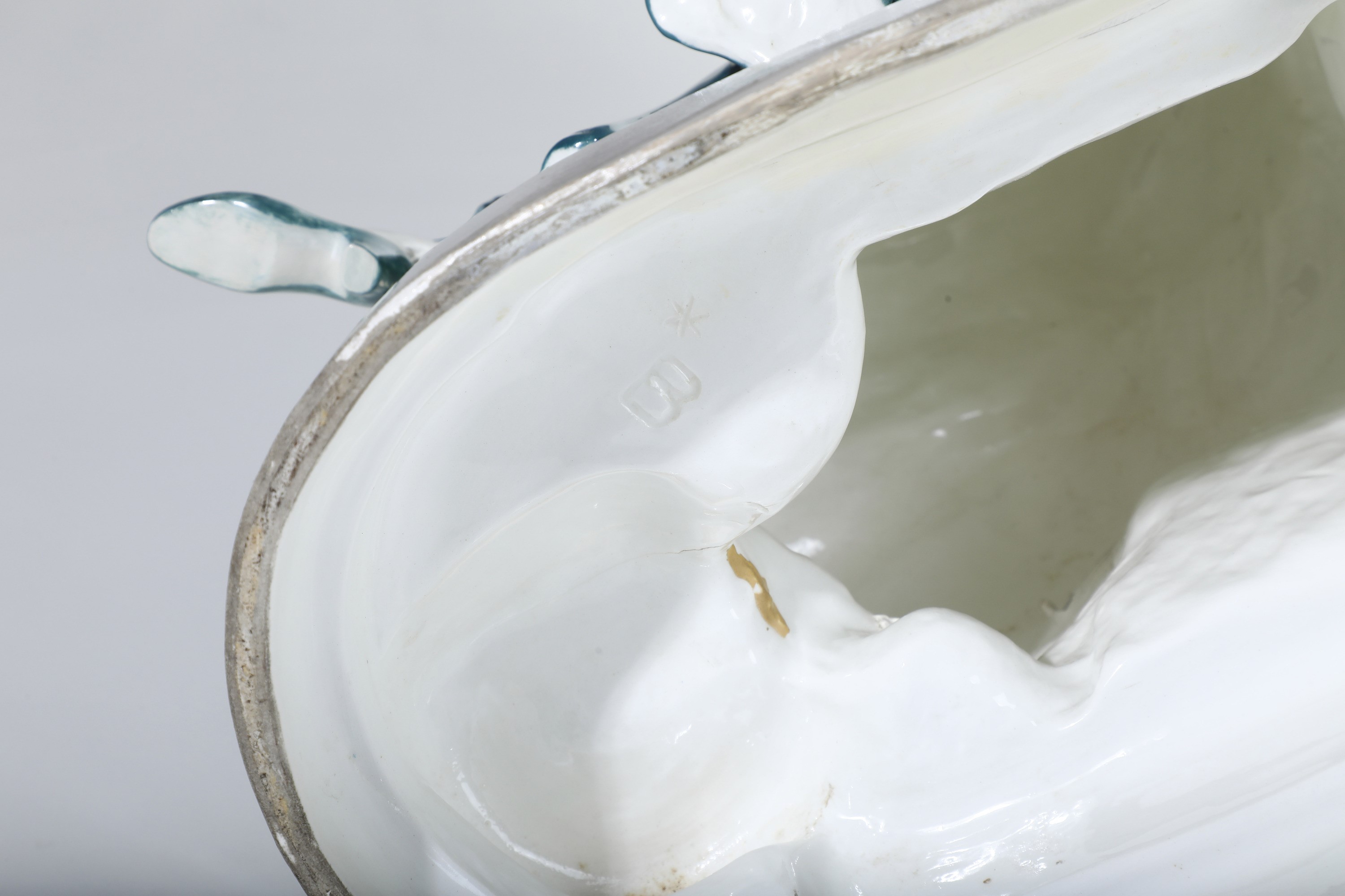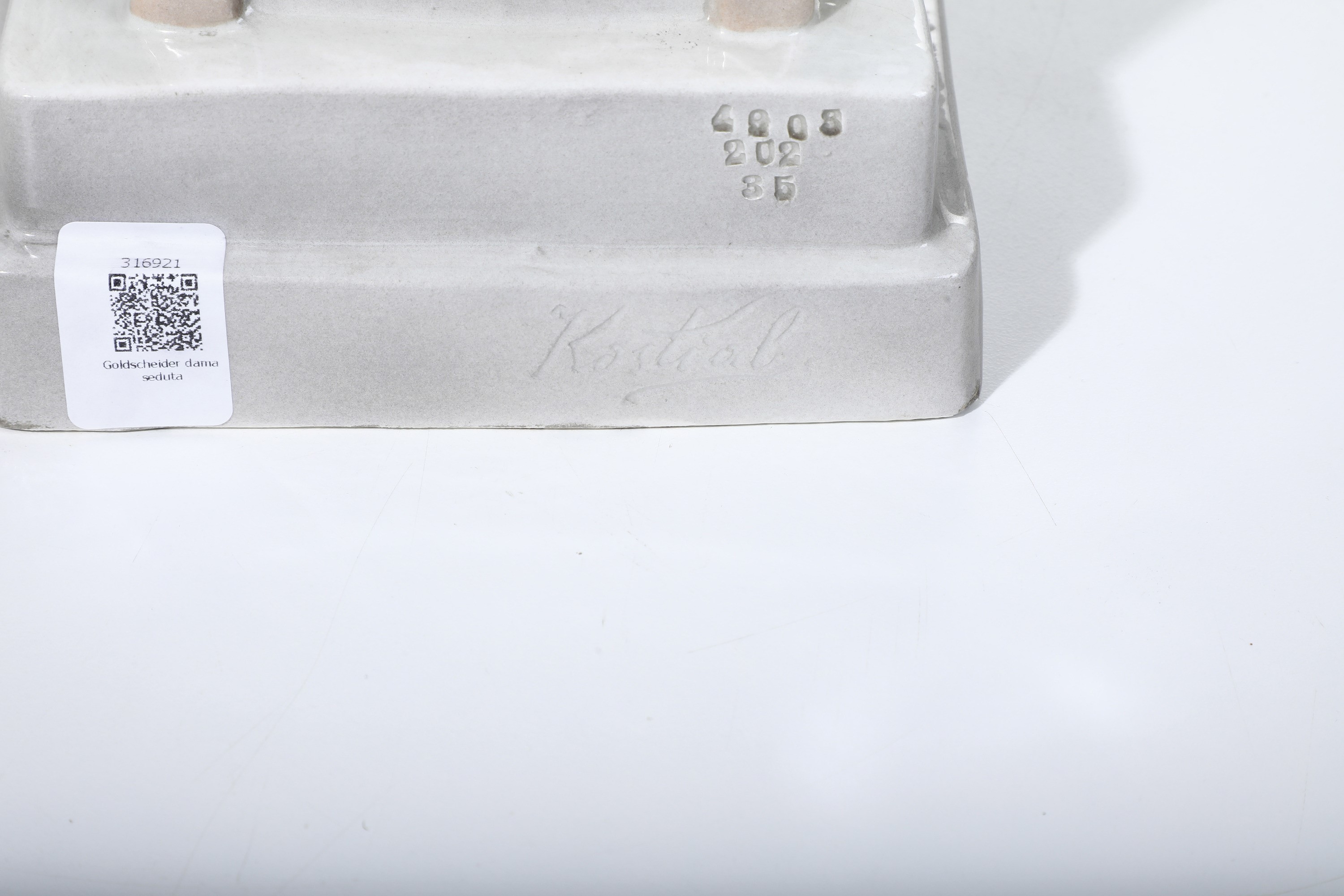 Figura di donna su poltrona in porcellana con decoro policromo.