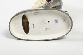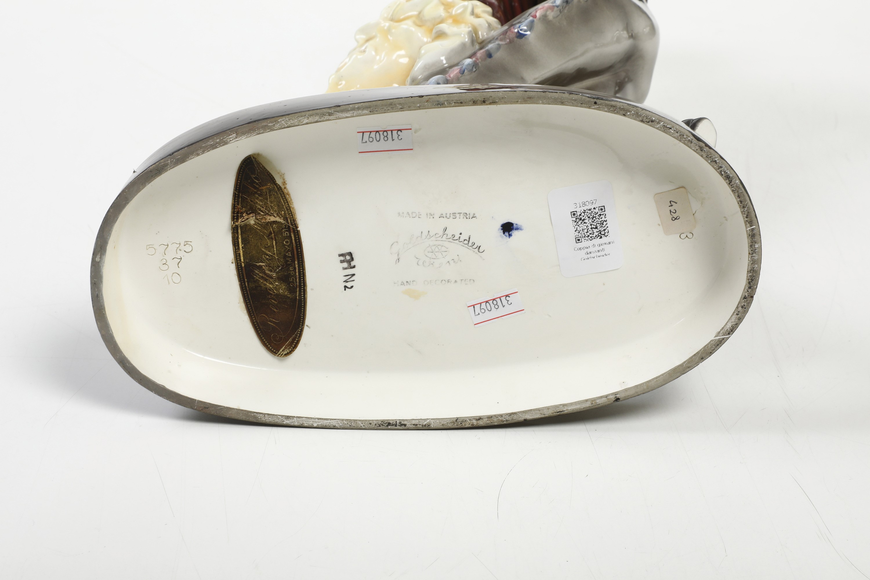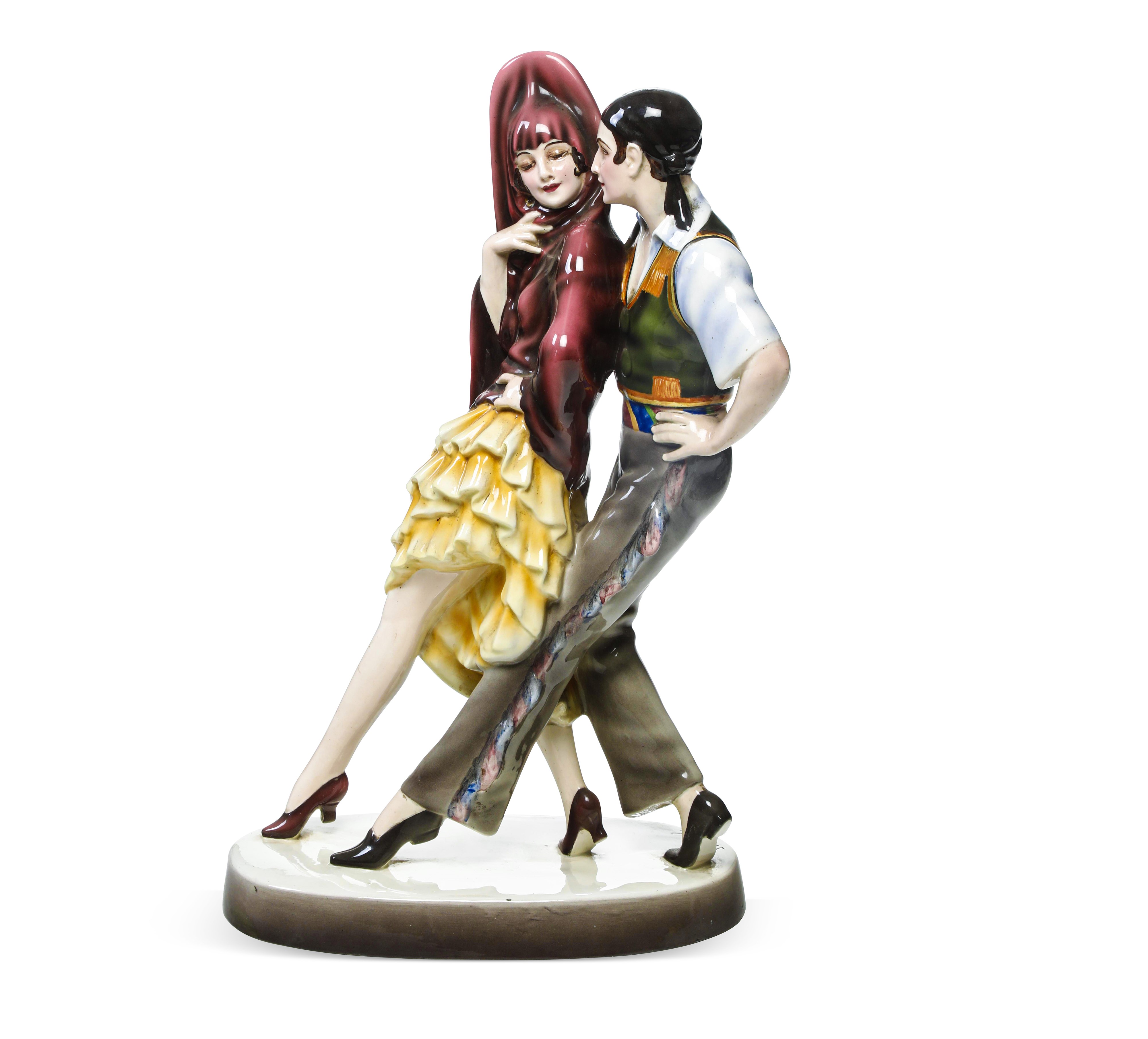 Scultura raffigurante coppia di ballerini spagnoli su basamento ovale in terraglia a colaggio con decoro a smalti policromi.