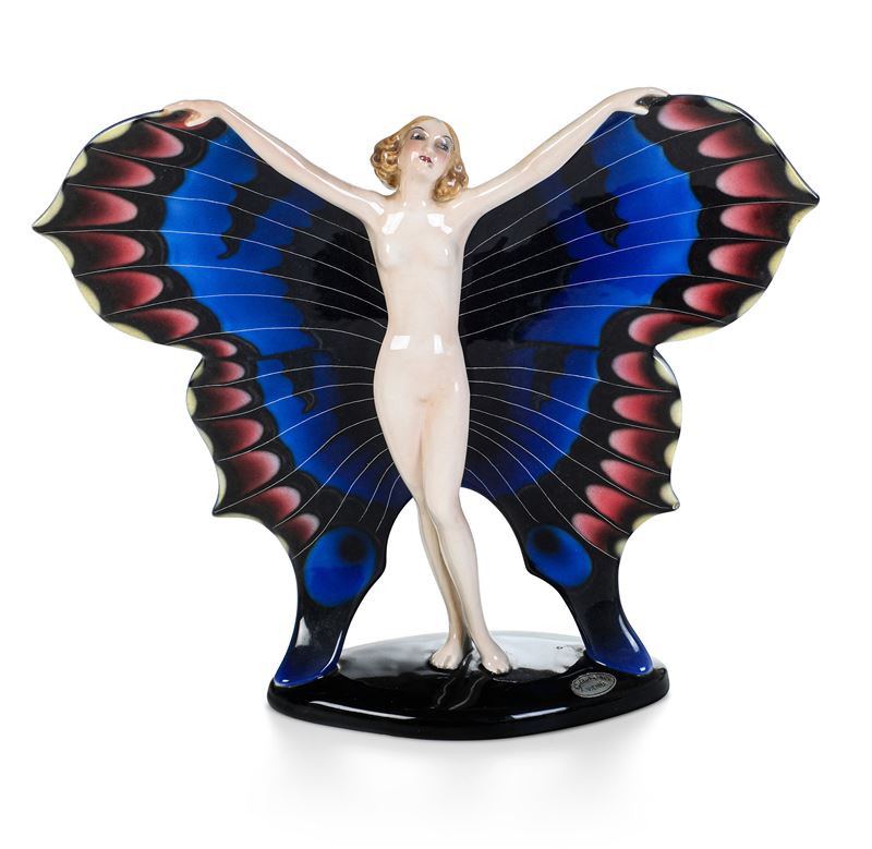 Scultura raffigurante nudino con ali di farfalla in porcellana con decoro policromo.