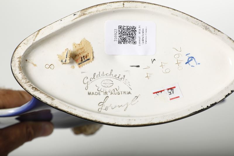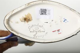 Marchio della manifattura, firma dell'autore impressi e vecchia etichetta cartacea.