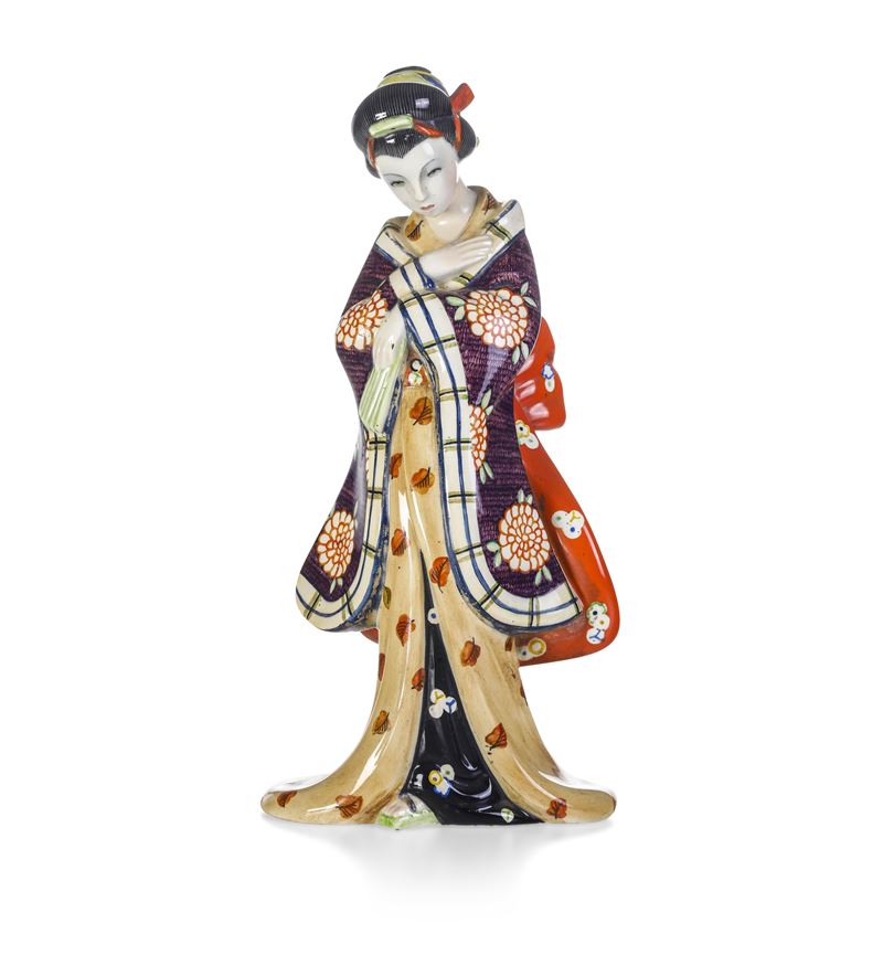 Figura di giapponesina in costume tradizionale in terraglia a colaggio con decoro policromo.