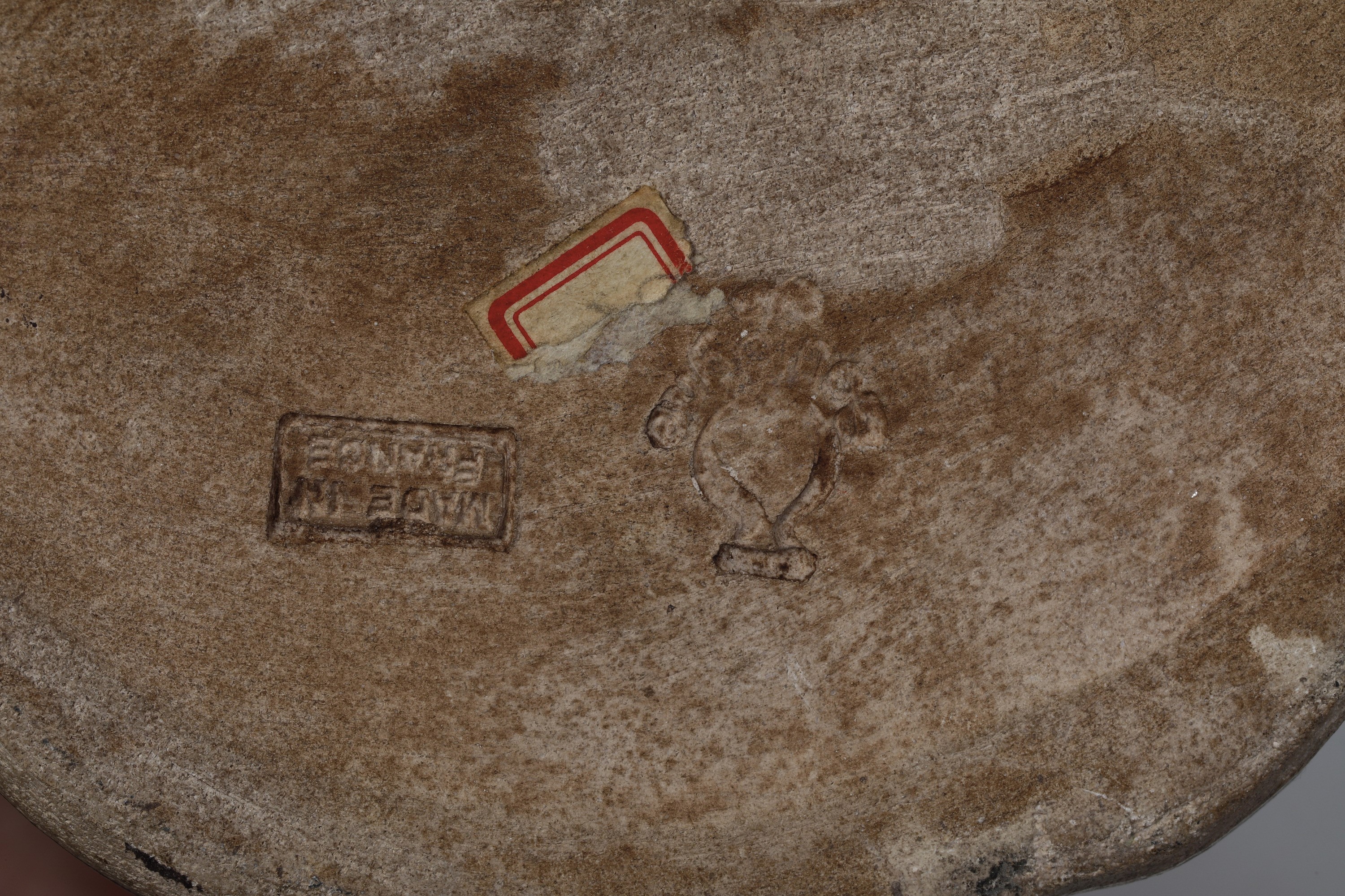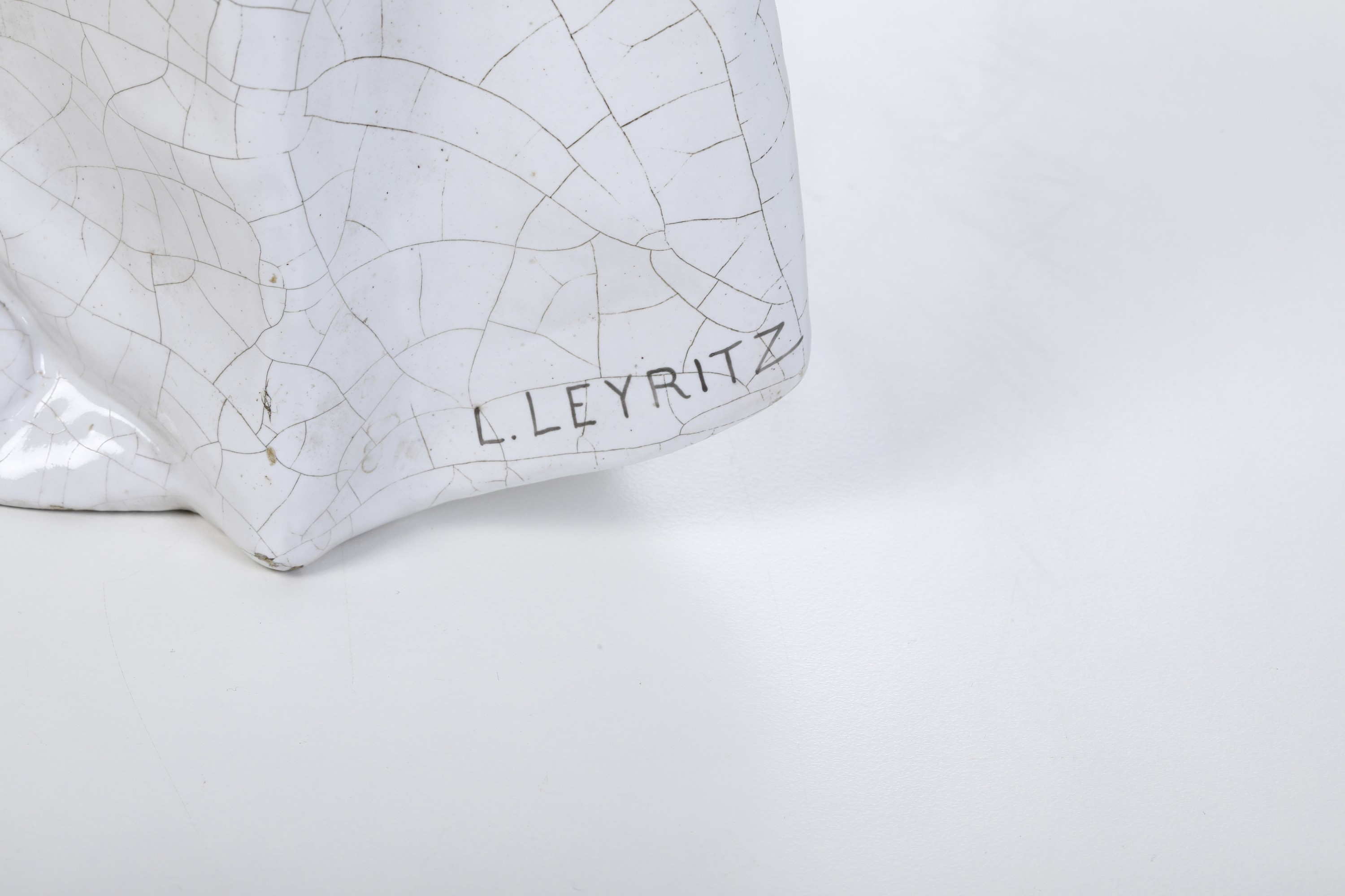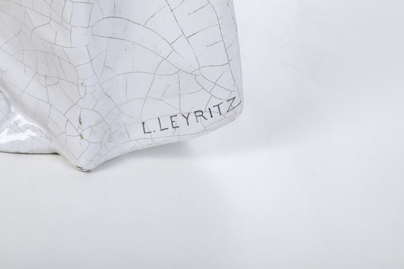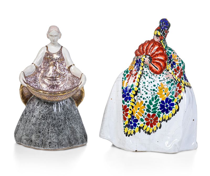 Scultura raffigurante donna in abito spagnolo in terracotta maiolicata con decoro policromo, firmata Leon Leyritz con marchio, e un'altra in ceramica con decoro policromo e a lustri argentati con marchio illeggibile.
