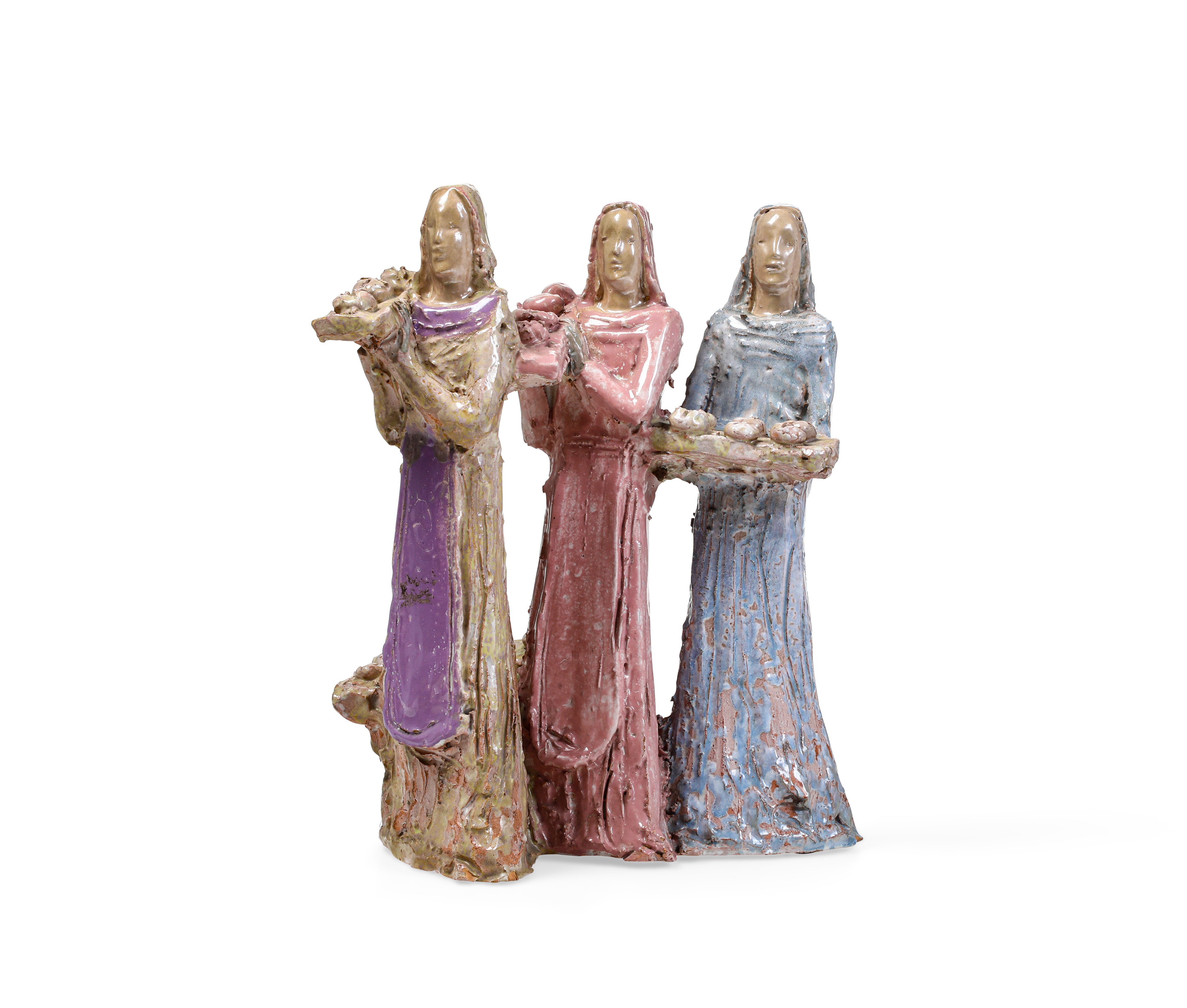 Gruppo di tre figure di donne in terracotta invetriata con decoro di smalti policromi. Pezzo unico.