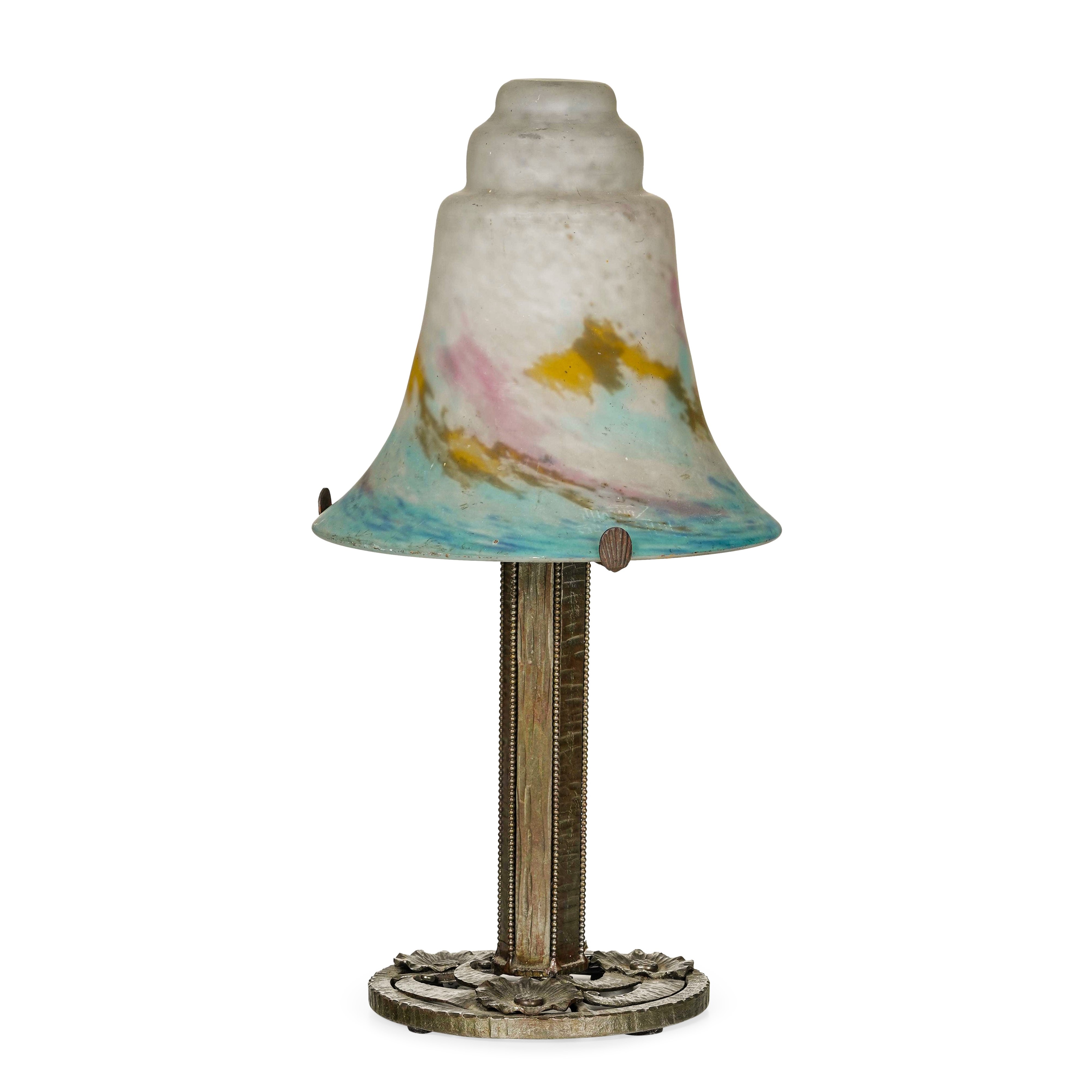 Lampada da tavolo con basamento in ferro lavorato a motivi vegetali. Diffusore a campana in pasta vitrea policroma e sabbiata.