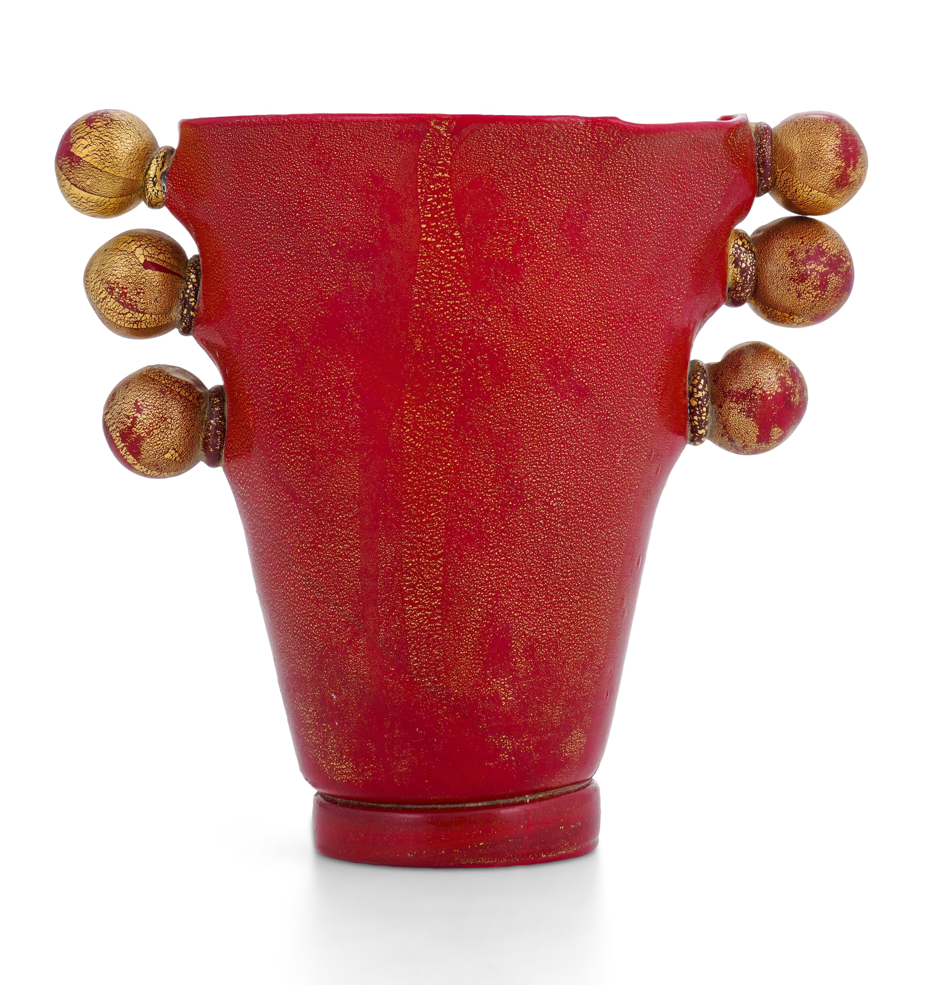 Vaso troncoconico in pasta vitrea rossa con anse a pomello e decoro di foglia oro sommersa.