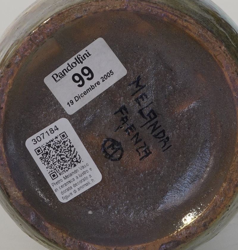 Vaso a clava in ceramica con decoro policromo di animali. Superficie interamente a lustri.