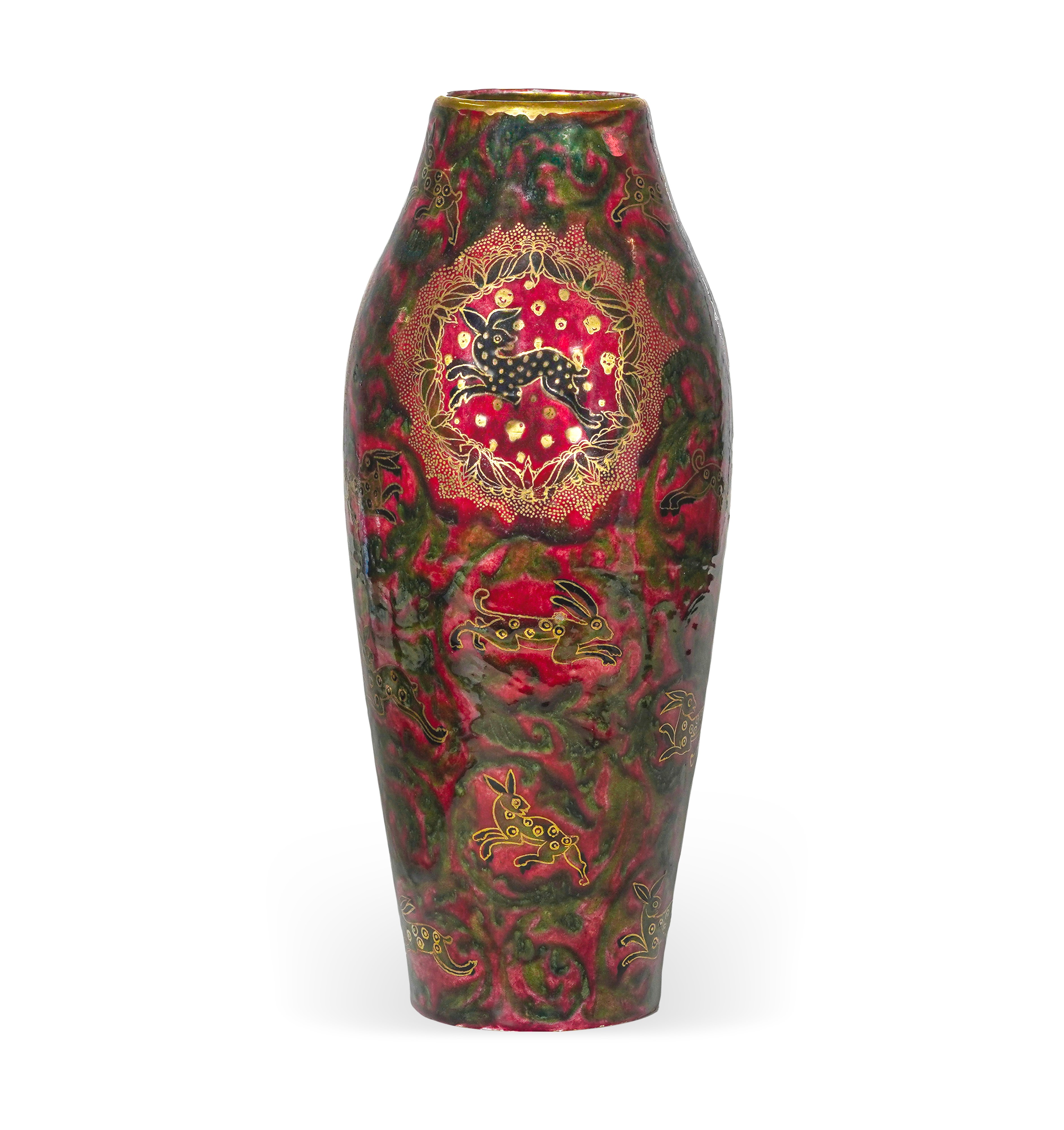 Vaso in terracotta maiolicata con decoro di animali e vegetali stilizzati a rilievo. Superficie a lustri con filettature in oro.