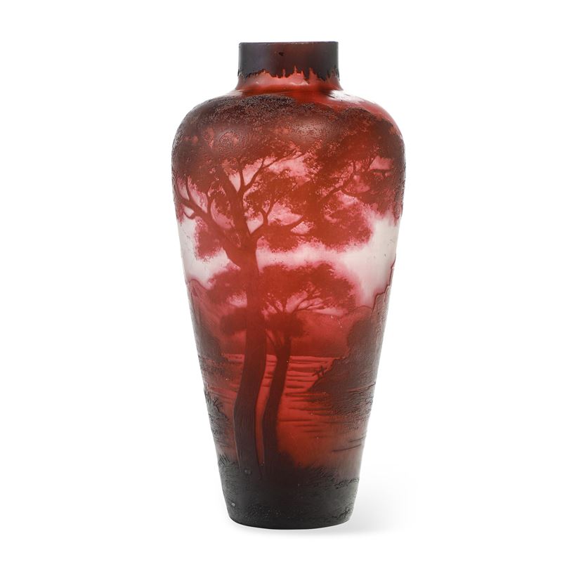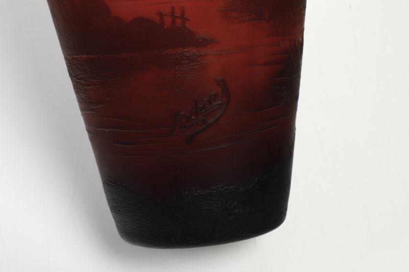Vaso a balaustro in vetro a cammeo con decoro di paesaggio.