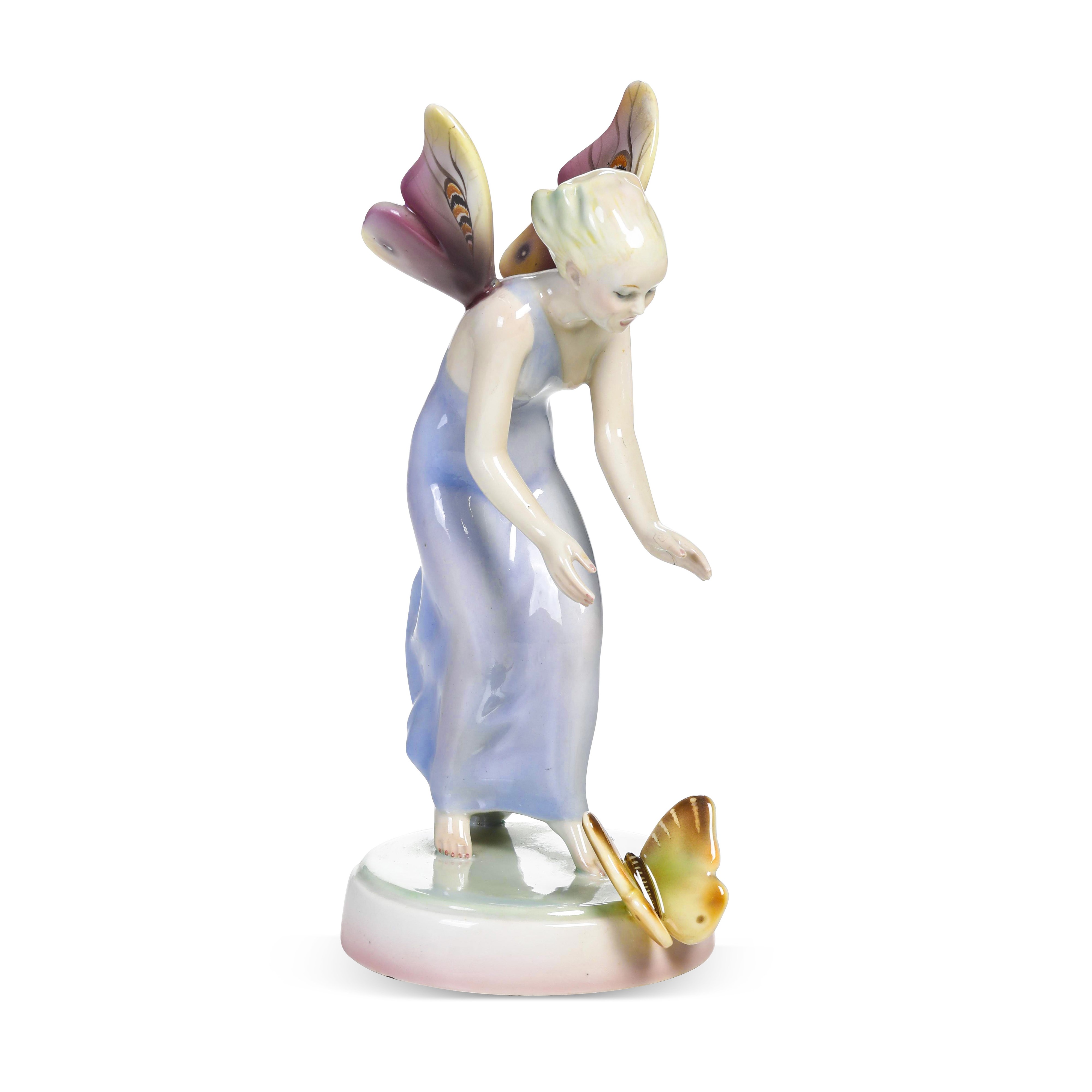 Scultura raffigurante fanciulla con ali di farfalla in terraglia a colaggio con decoro policromo.