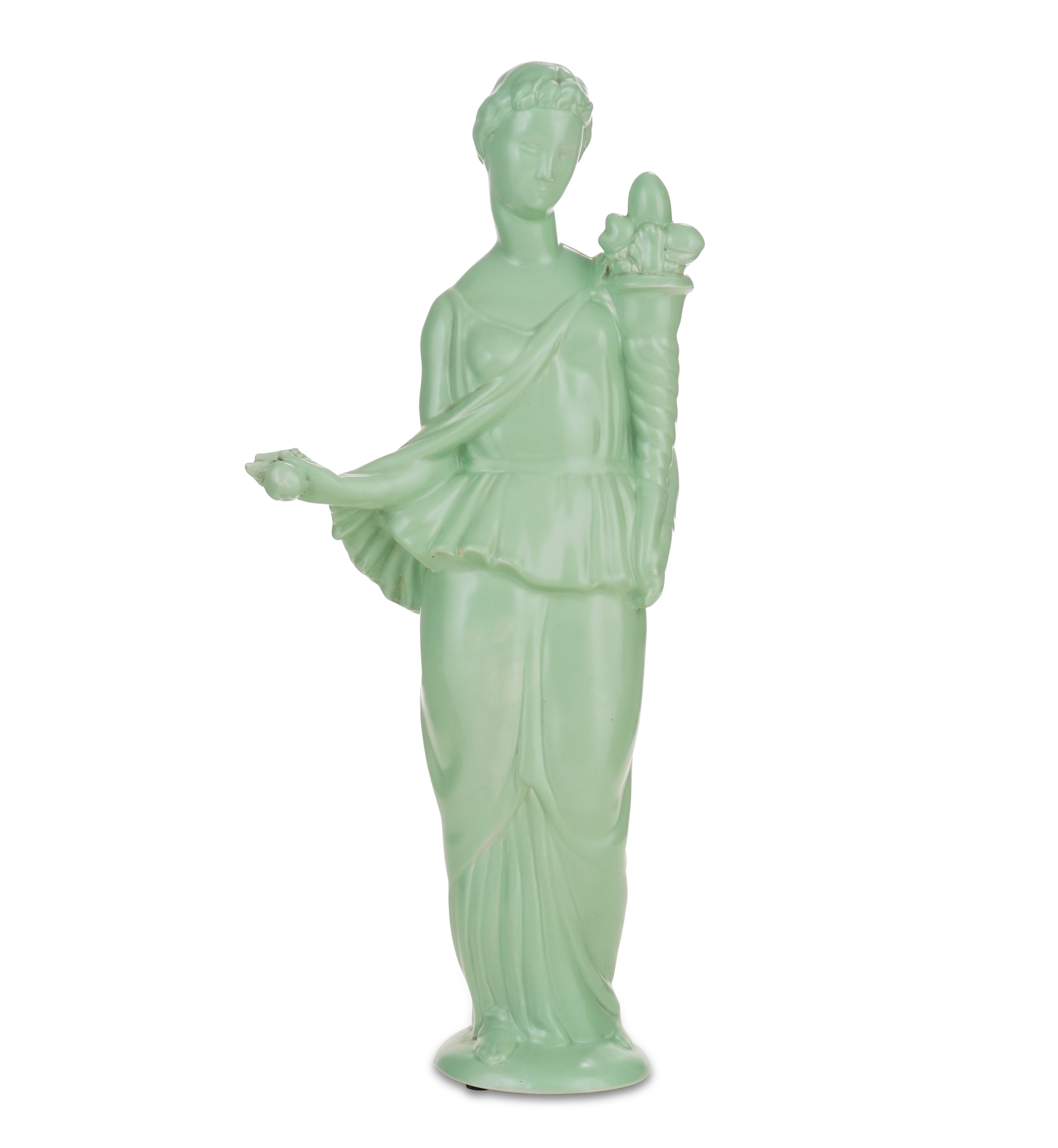 Statua raffigurante figura classica con cornucopia in terraglia a colaggio con decoro di smalto celadon.