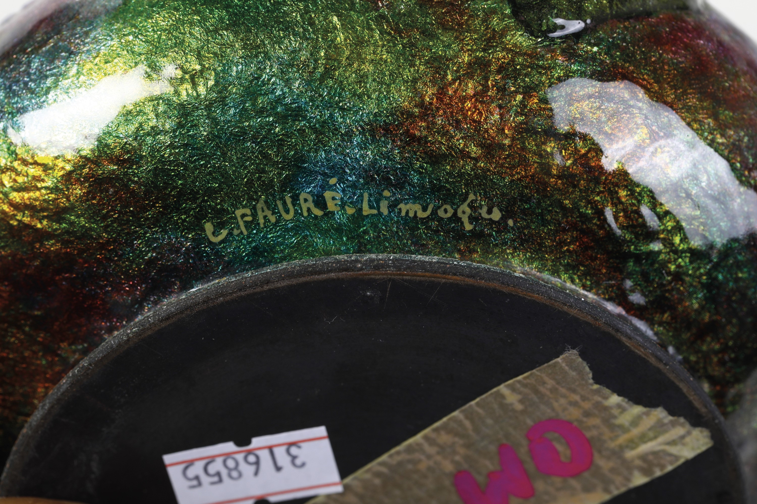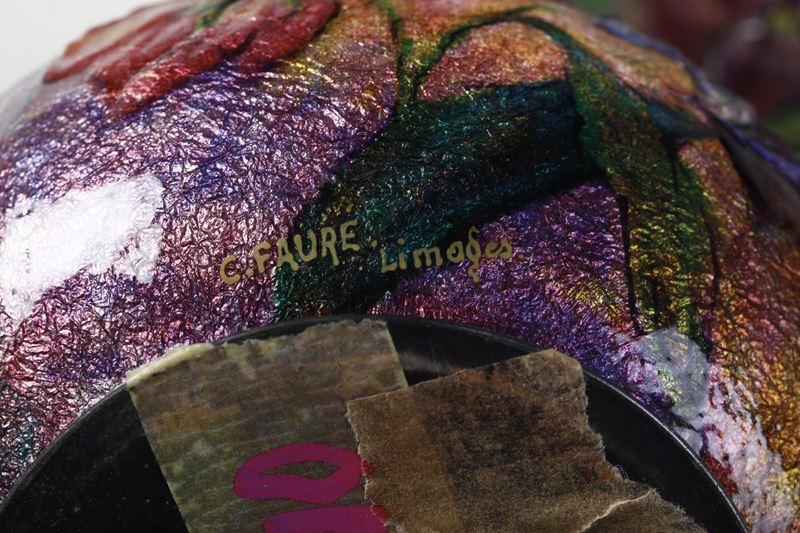 Coppia di piccoli vasi in rame con decoro floreale a smalti policromi a rilievo.