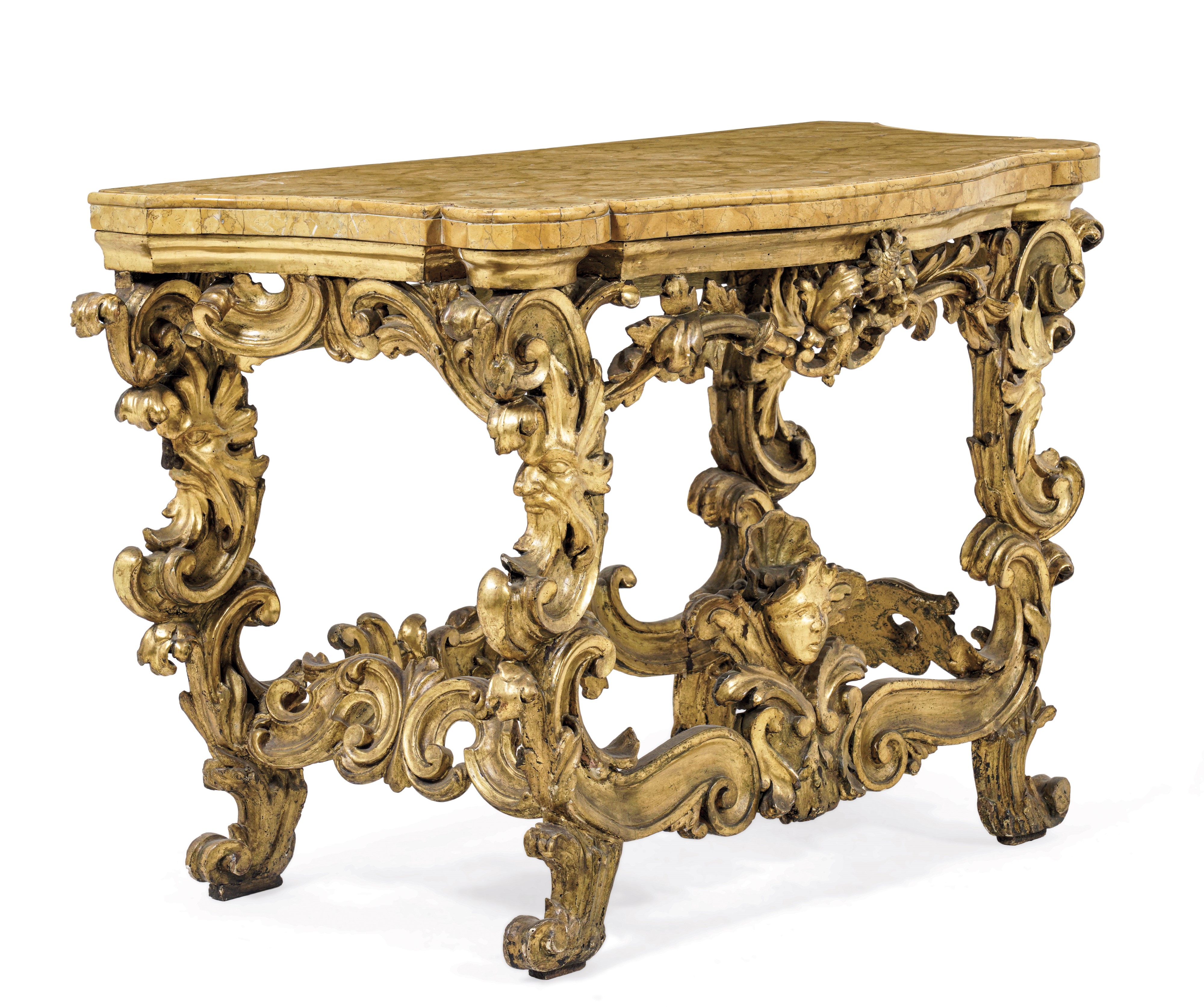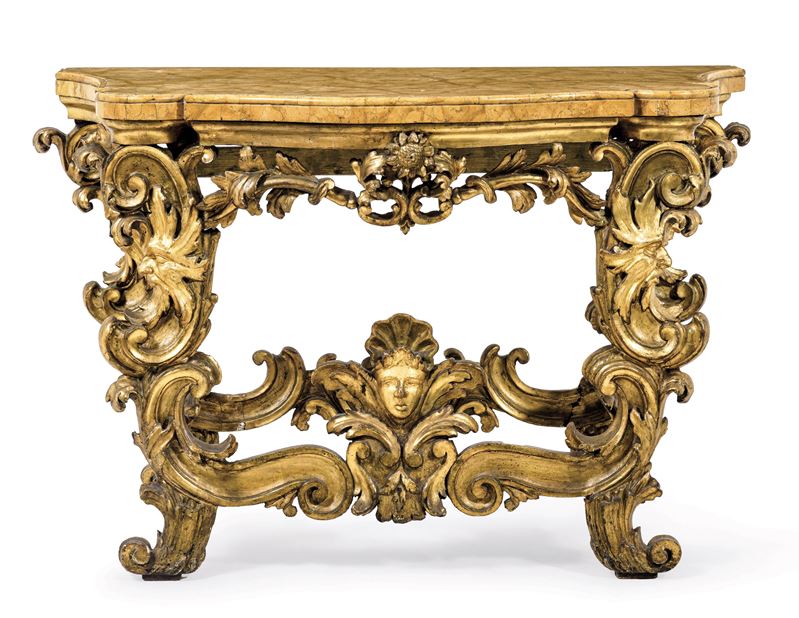 legno dorato scolpito a corpose volute fogliate; fascia sottopiano traforata centrata da girasole, gambe a doppia voluta arricchite da mascherone zoomorfo, riunite inferiormente da un ricciolo di voluta affrontato con al centro una testina di putto; piano in marmo giallo di linea sagomata