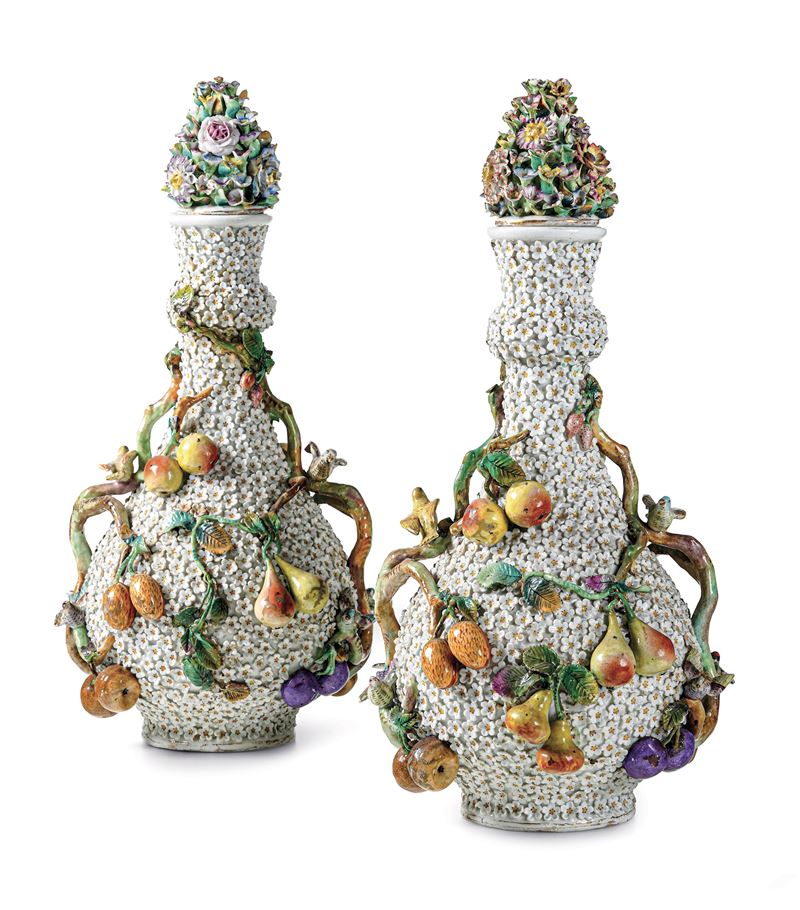 I vasi detti “Schneeball” si ispirano ad un modello settecentesco di Meissen dalle pareti decorate a fitti fiori di viburno e rami a rilievo con vari frutti, foglie e uccellini