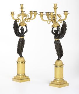 Coppia di candelabri in bronzo dorato e patinato. XIX secolo