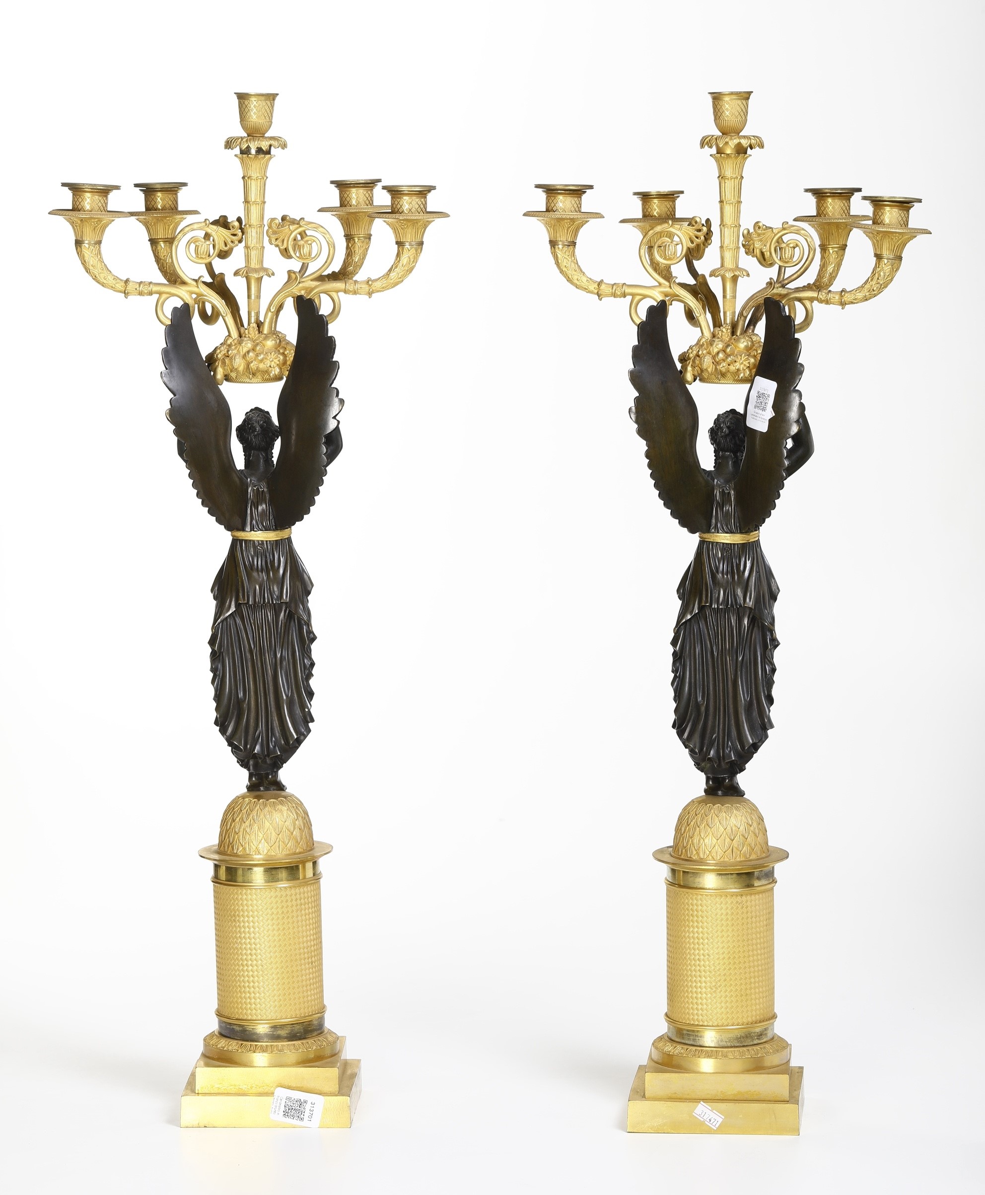 fusto a foggia di figura alata in bronzo brunito che regge cinque fiamme a volute in bronzo dorato, base a colonna con decoro geometrico in bronzo dorato