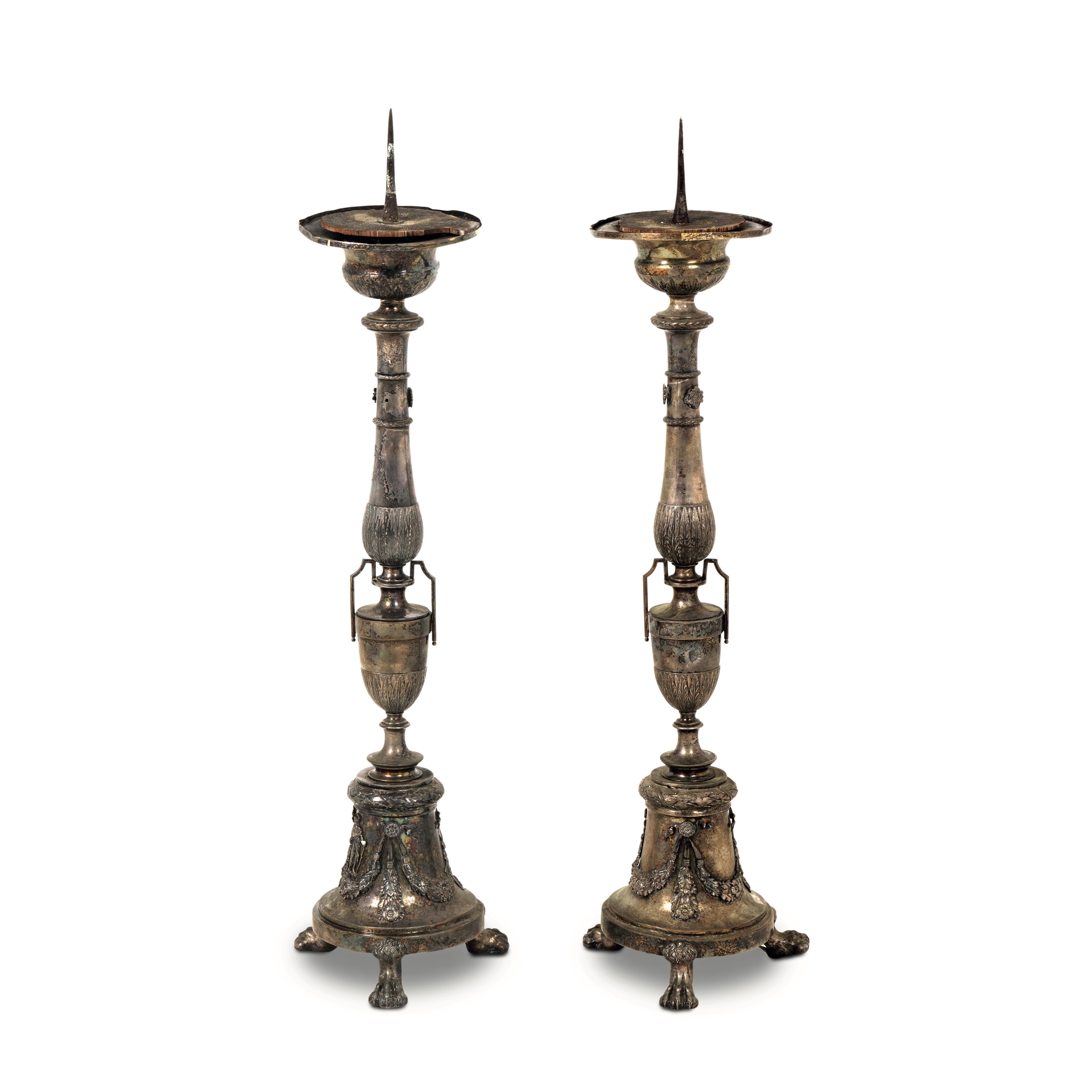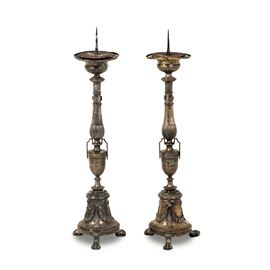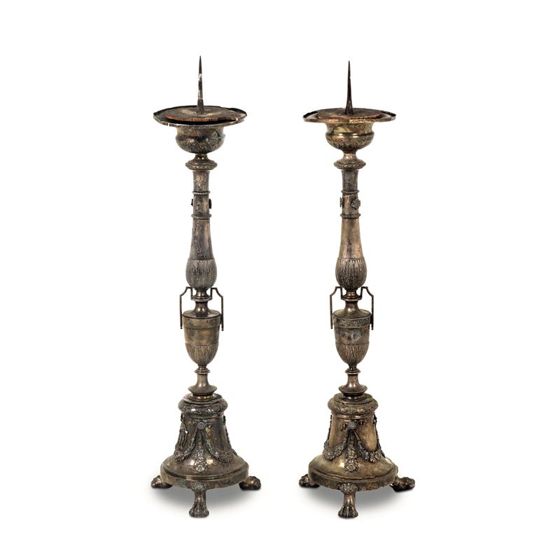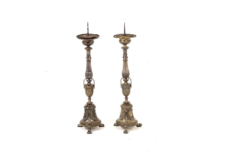 Coppia di candelieri in metallo argentato. XVIII-XIX secolo